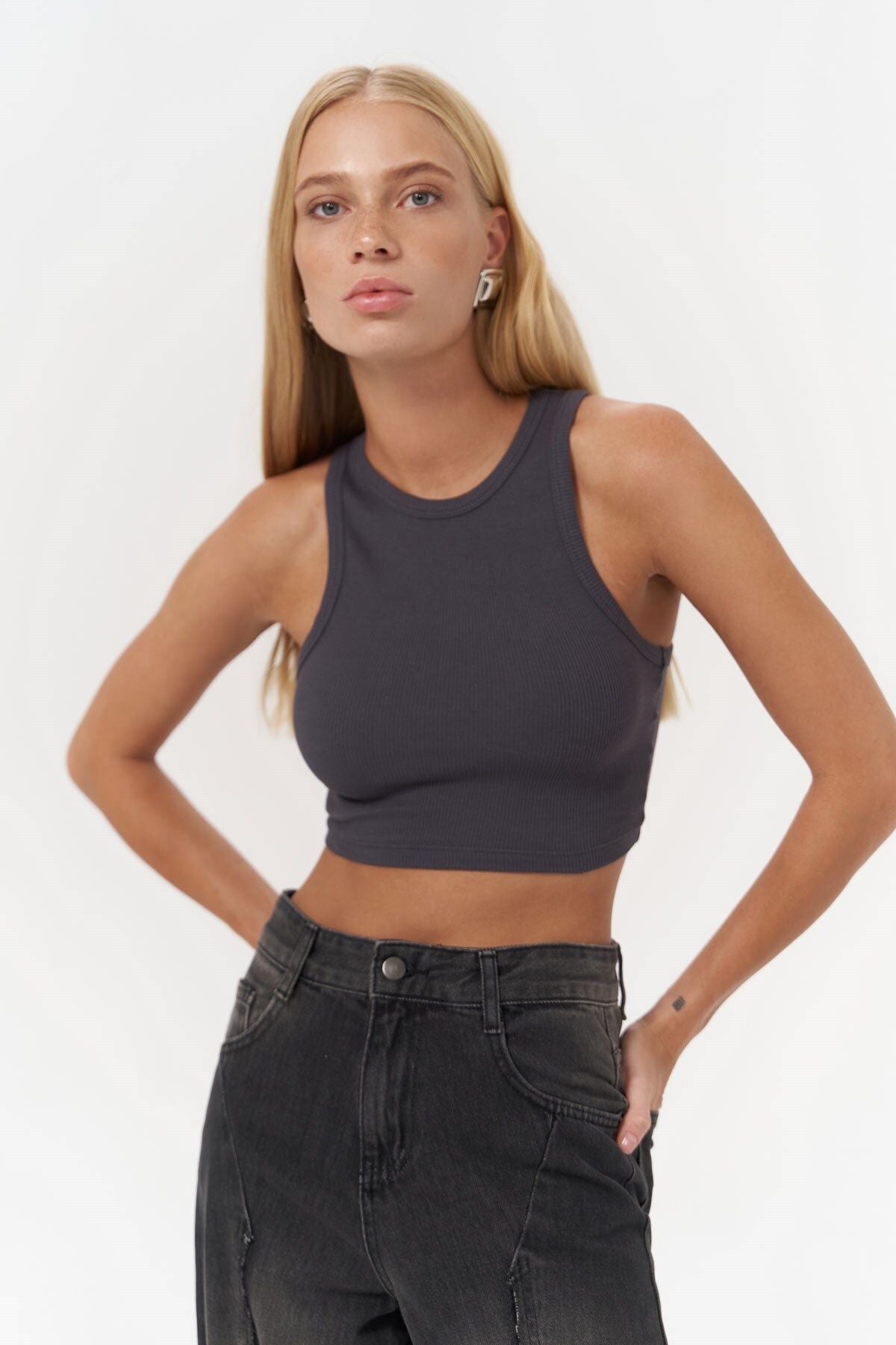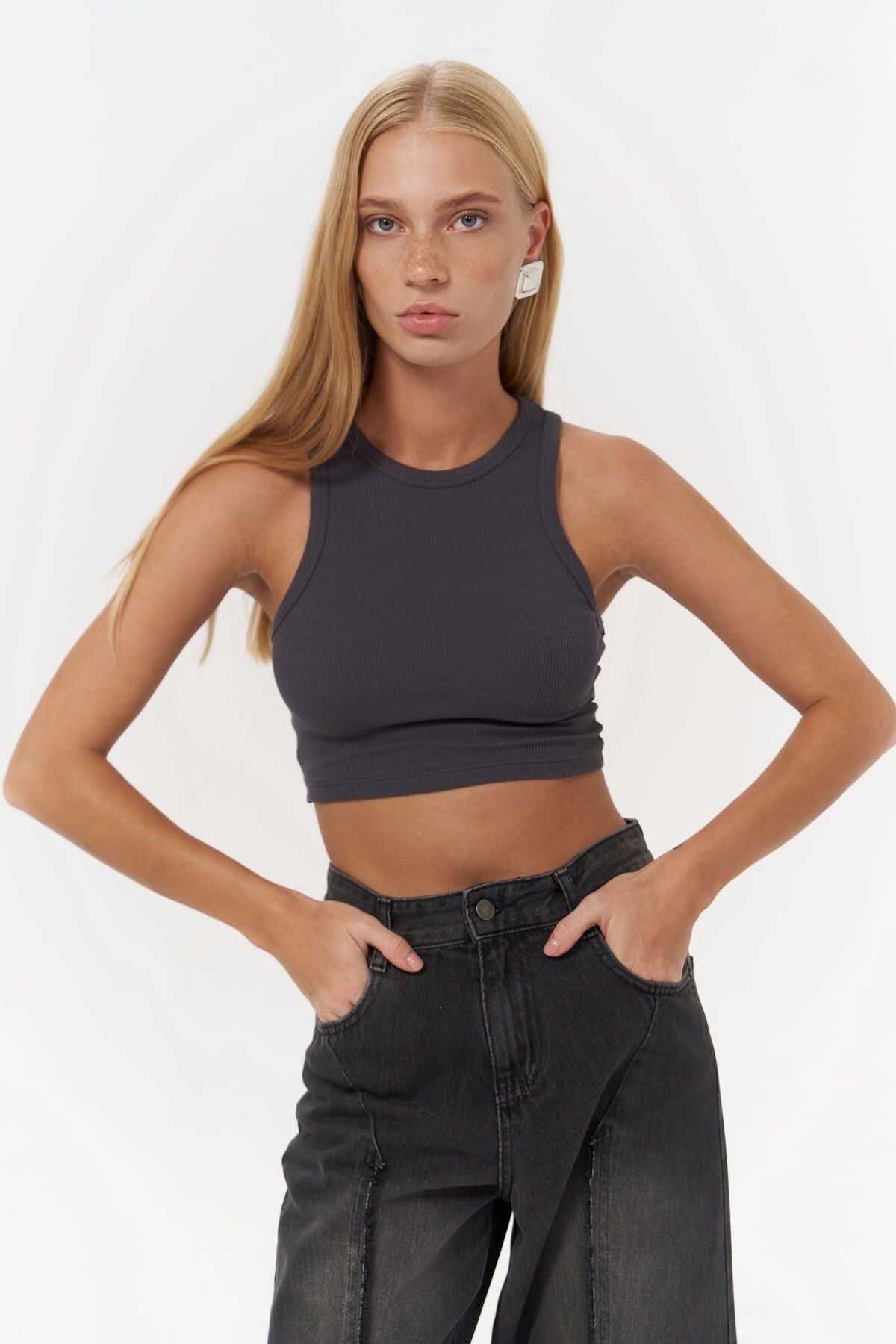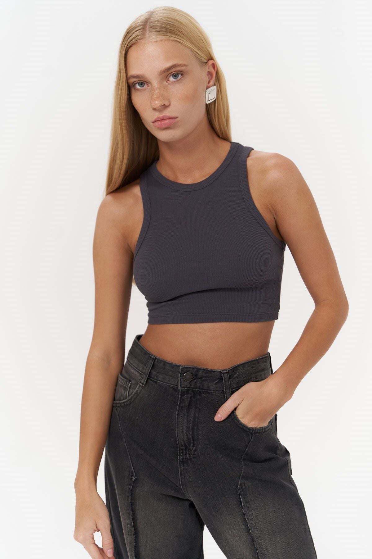 Fleur Fitilli Halter Yaka Antrasit Crop
