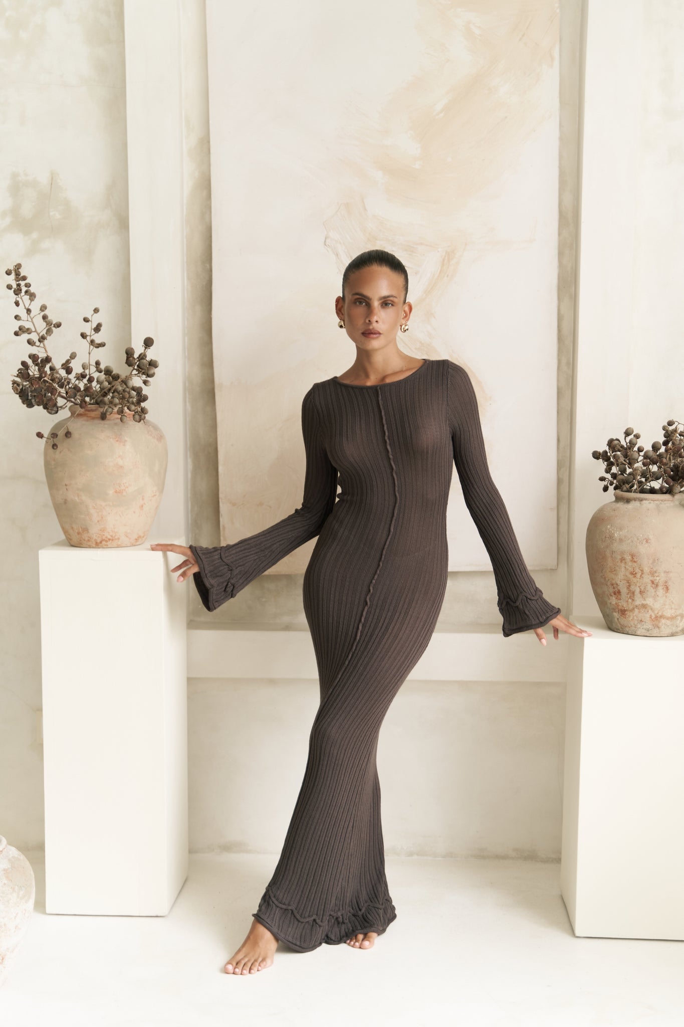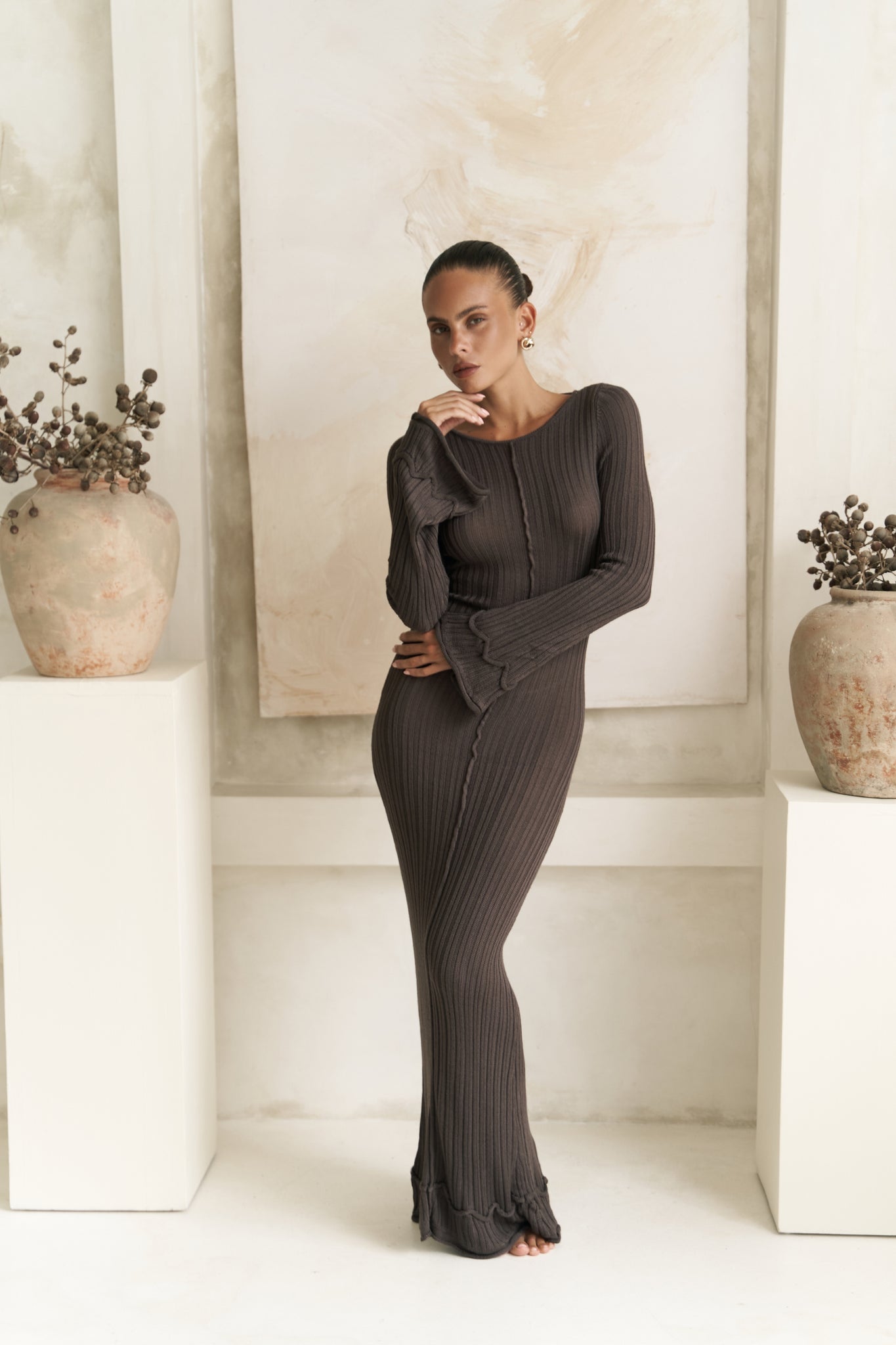 Matias Sırt Dekolteli Boz Kahve Triko Uzun Elbise