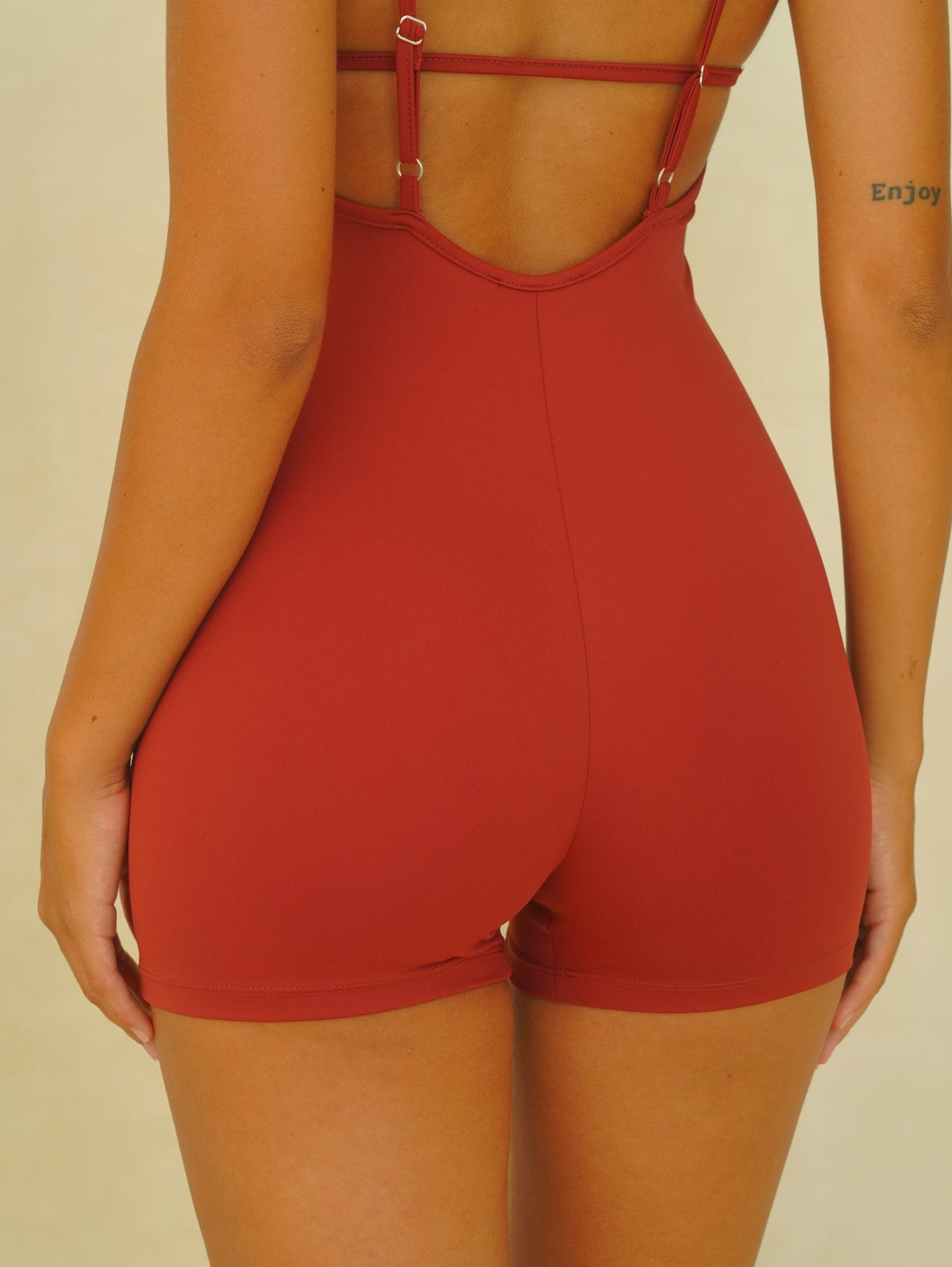 Sırtı açık, ince askılı ve kısa pantolonlu tulum. Dayanıklı, çabuk kuruyan ve nefes alabilir kumaş. Cupsız, lazer kesim.