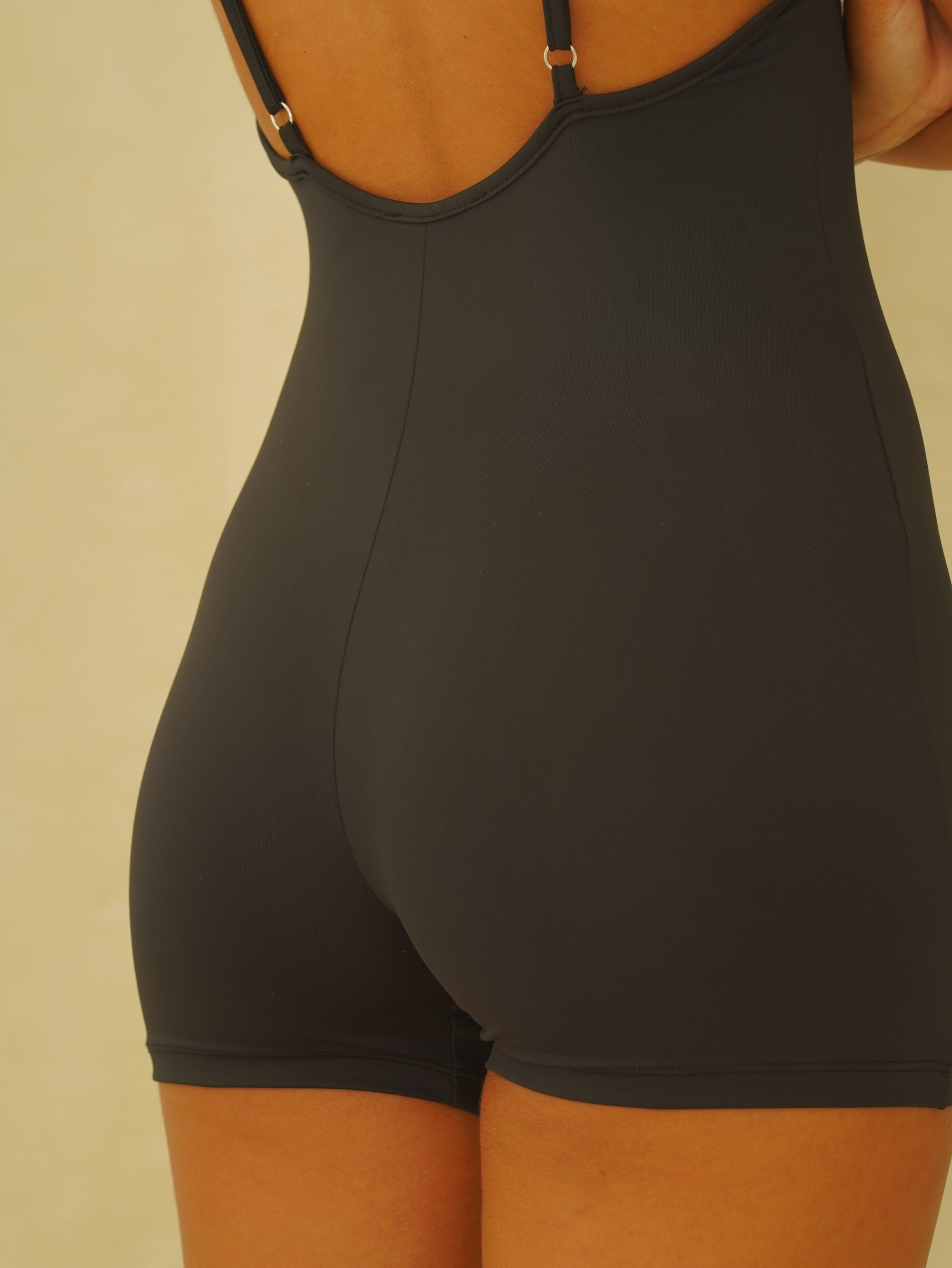 Sırtı açık, ince askılı ve kısa pantolonlu tulum. Dayanıklı, çabuk kuruyan ve nefes alabilir kumaş. Cupsız, lazer kesim.