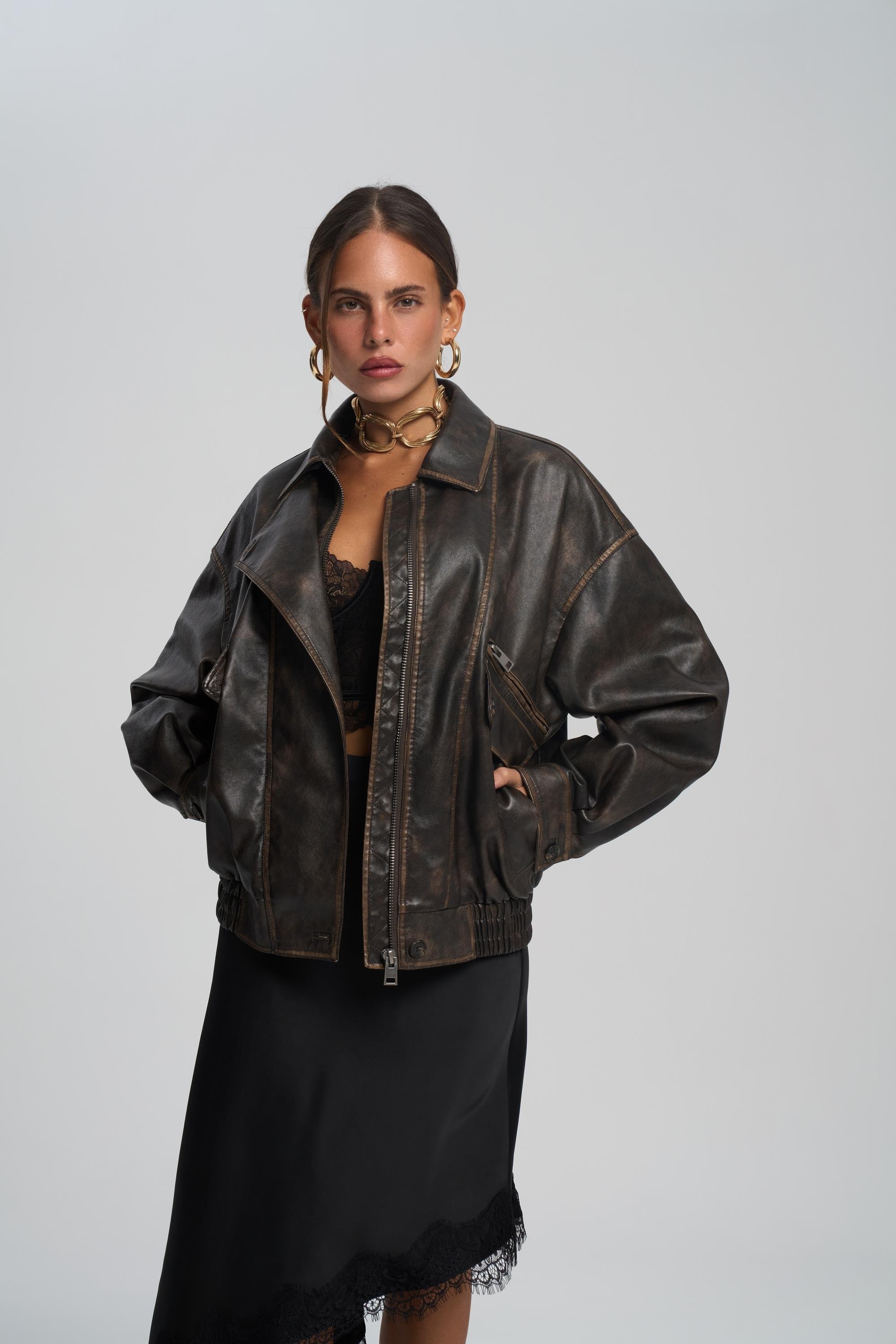 Oversize fit faux leather jacket with zipper and top closure. Pocket detail.