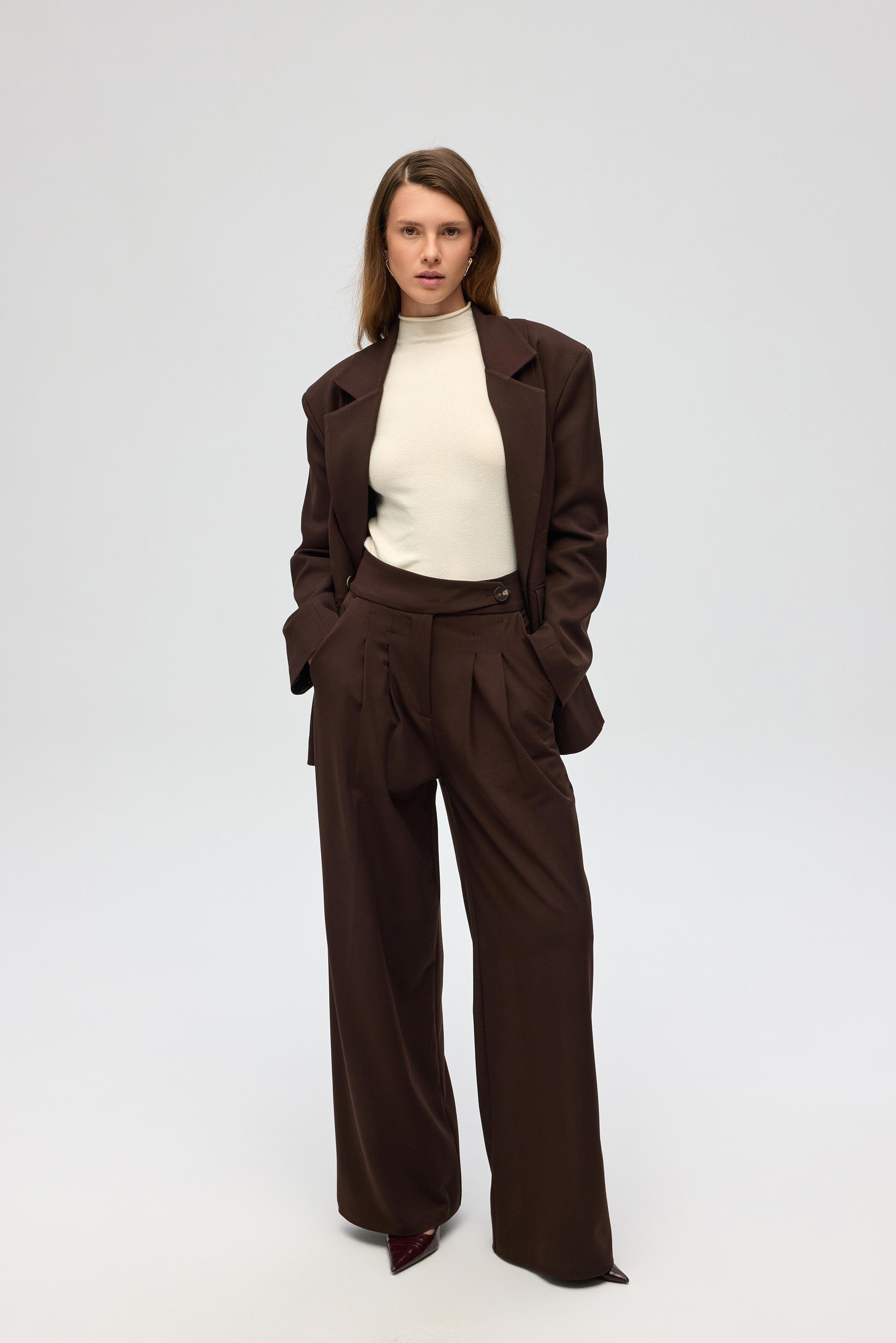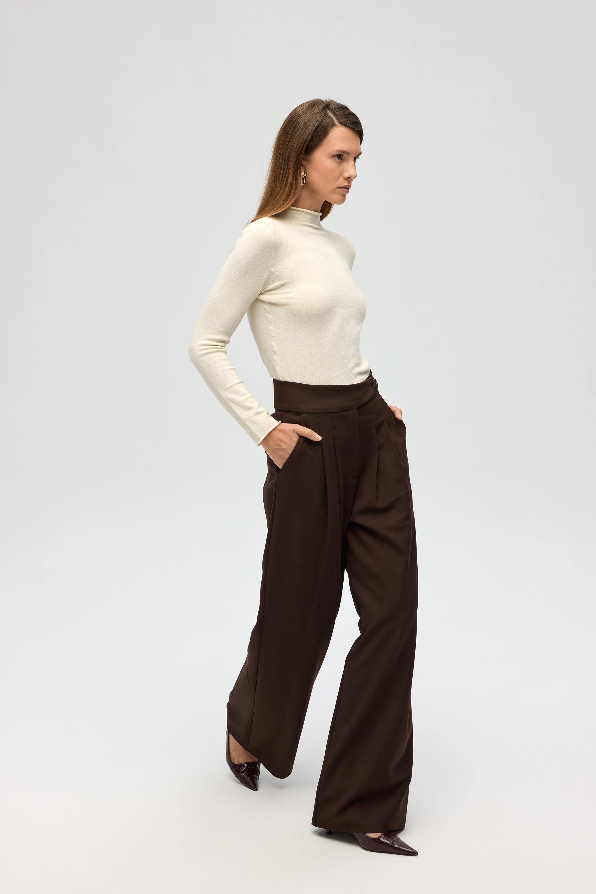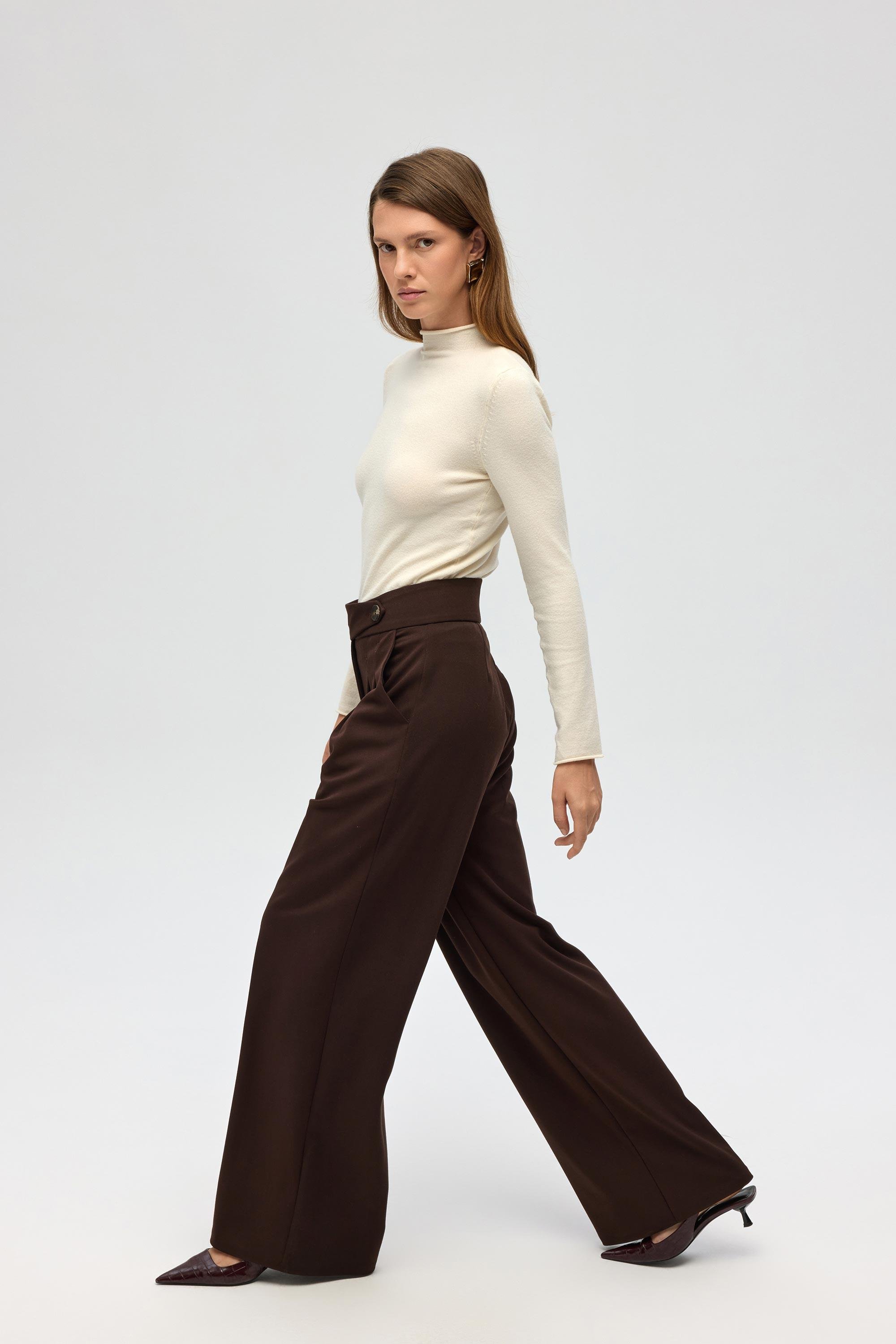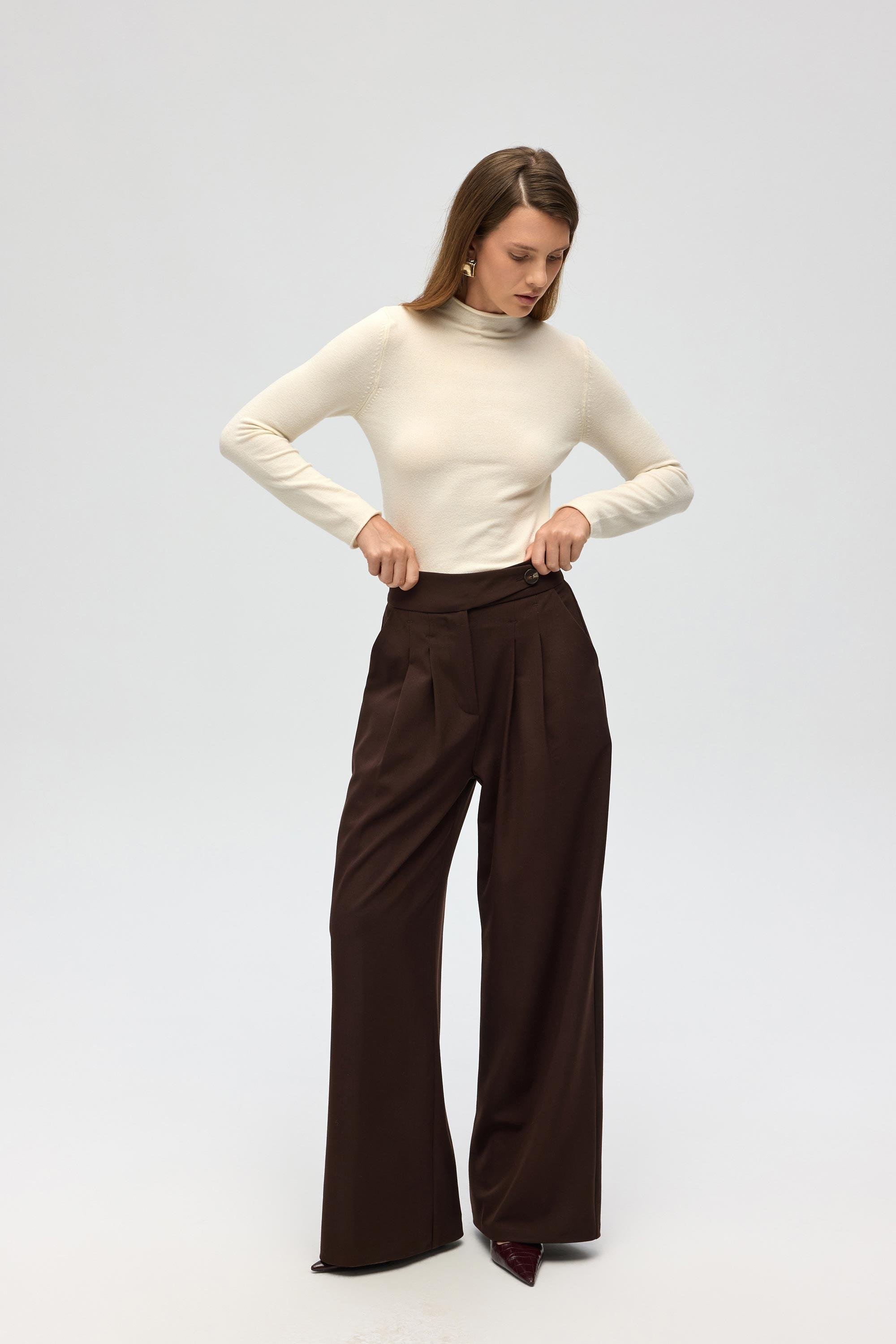 Bele oturan, paçası geniş formda, kemeri asimetrik kapamalı, pileli ve puntorez dikiş detaylı palazzo pantolon.