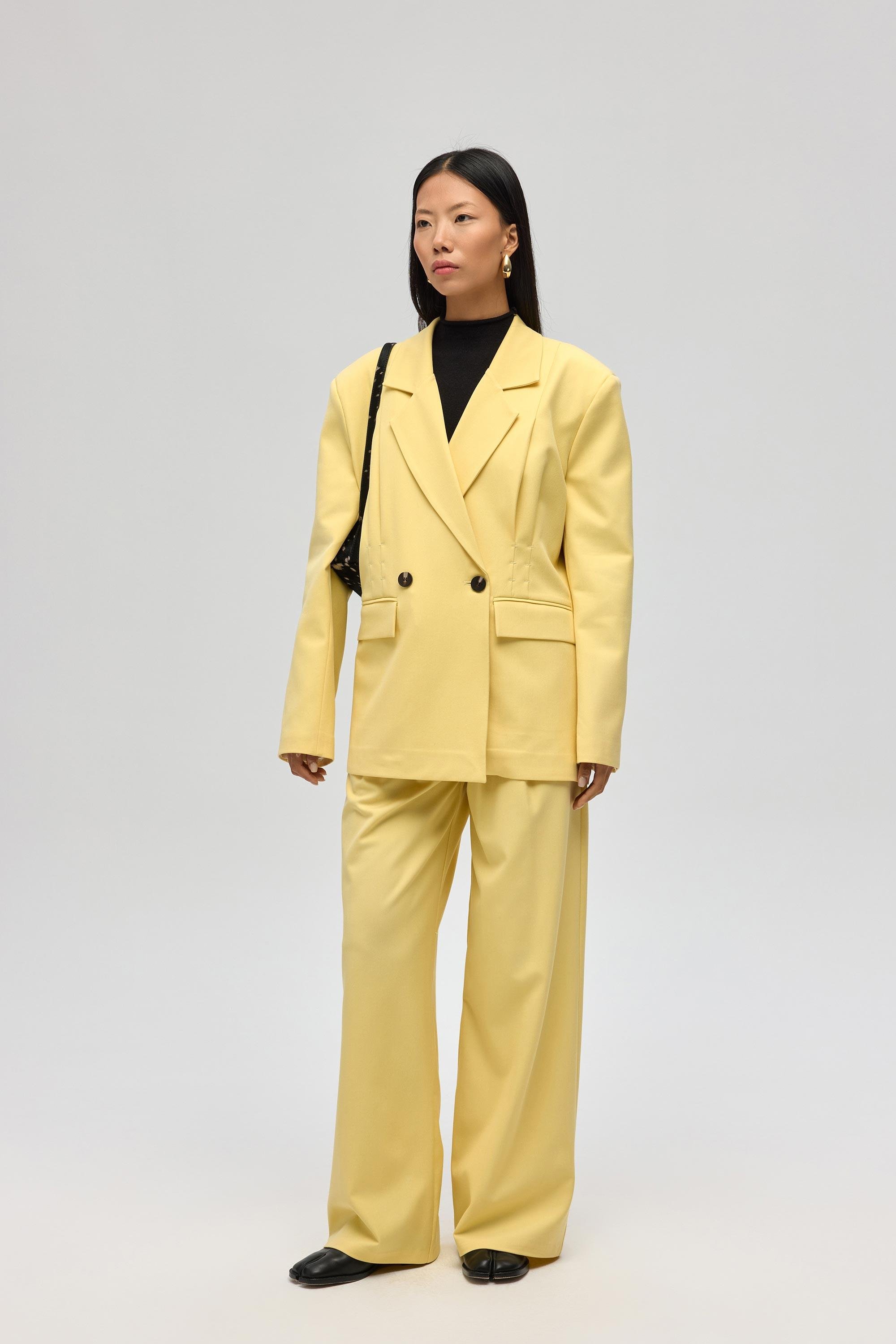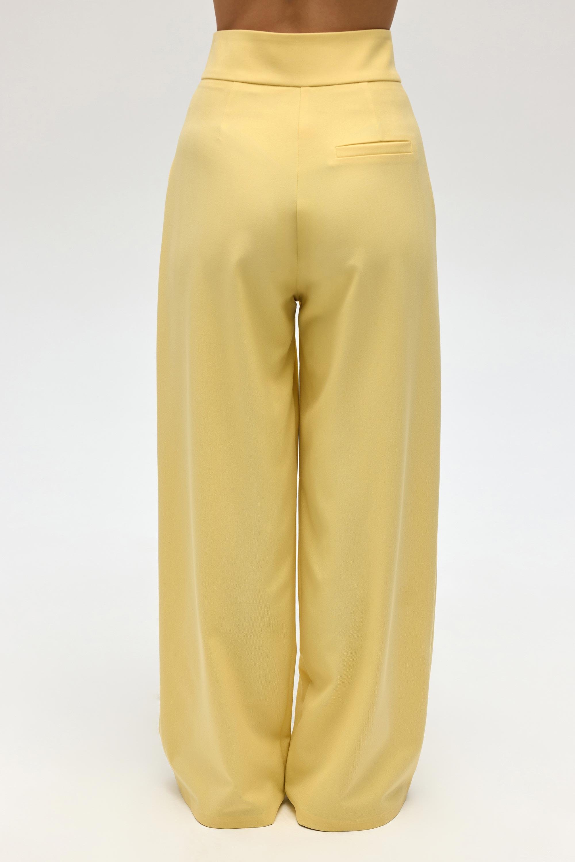 Bele oturan, paçası geniş formda, kemeri asimetrik kapamalı, pileli ve puntorez dikiş detaylı palazzo pantolon.