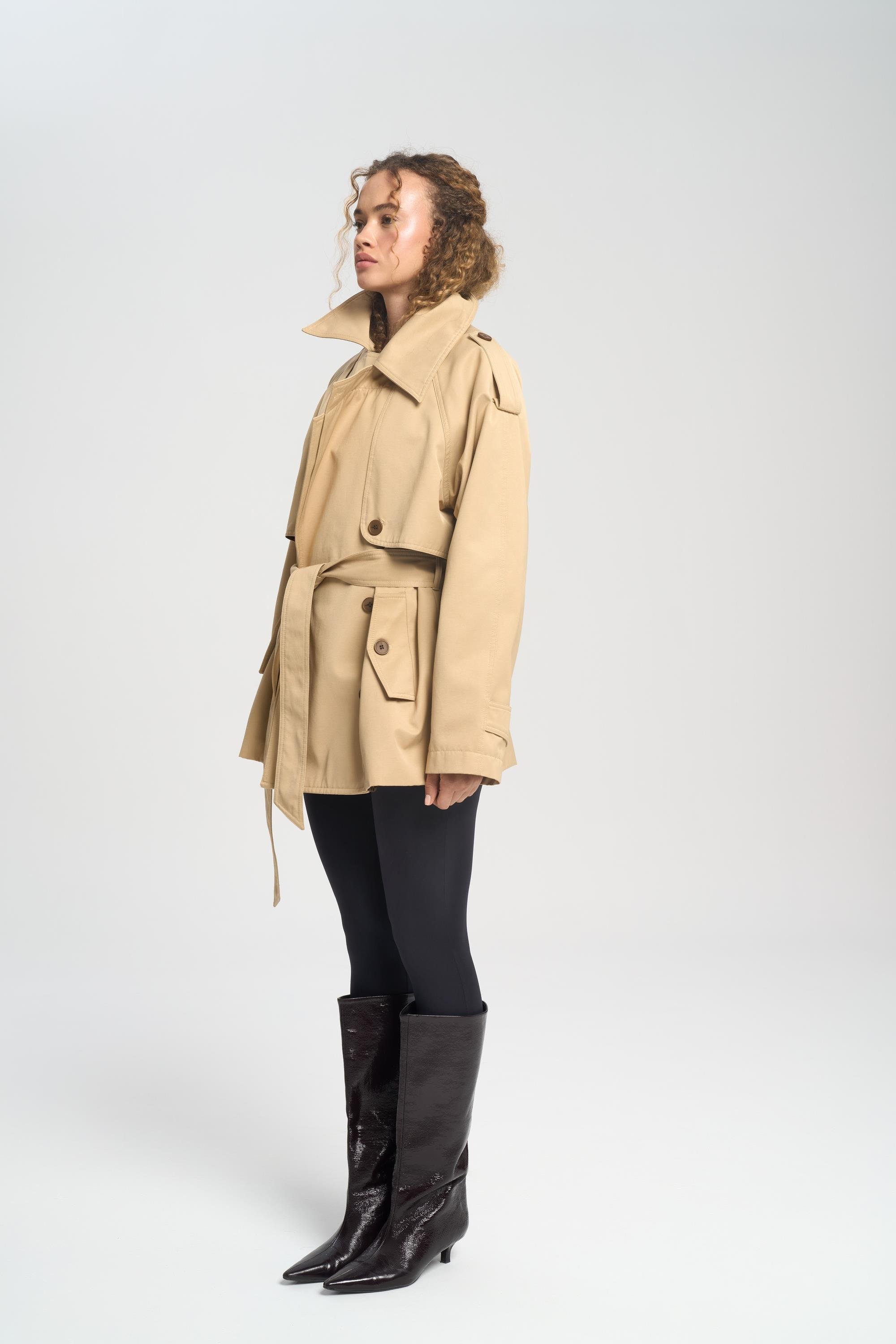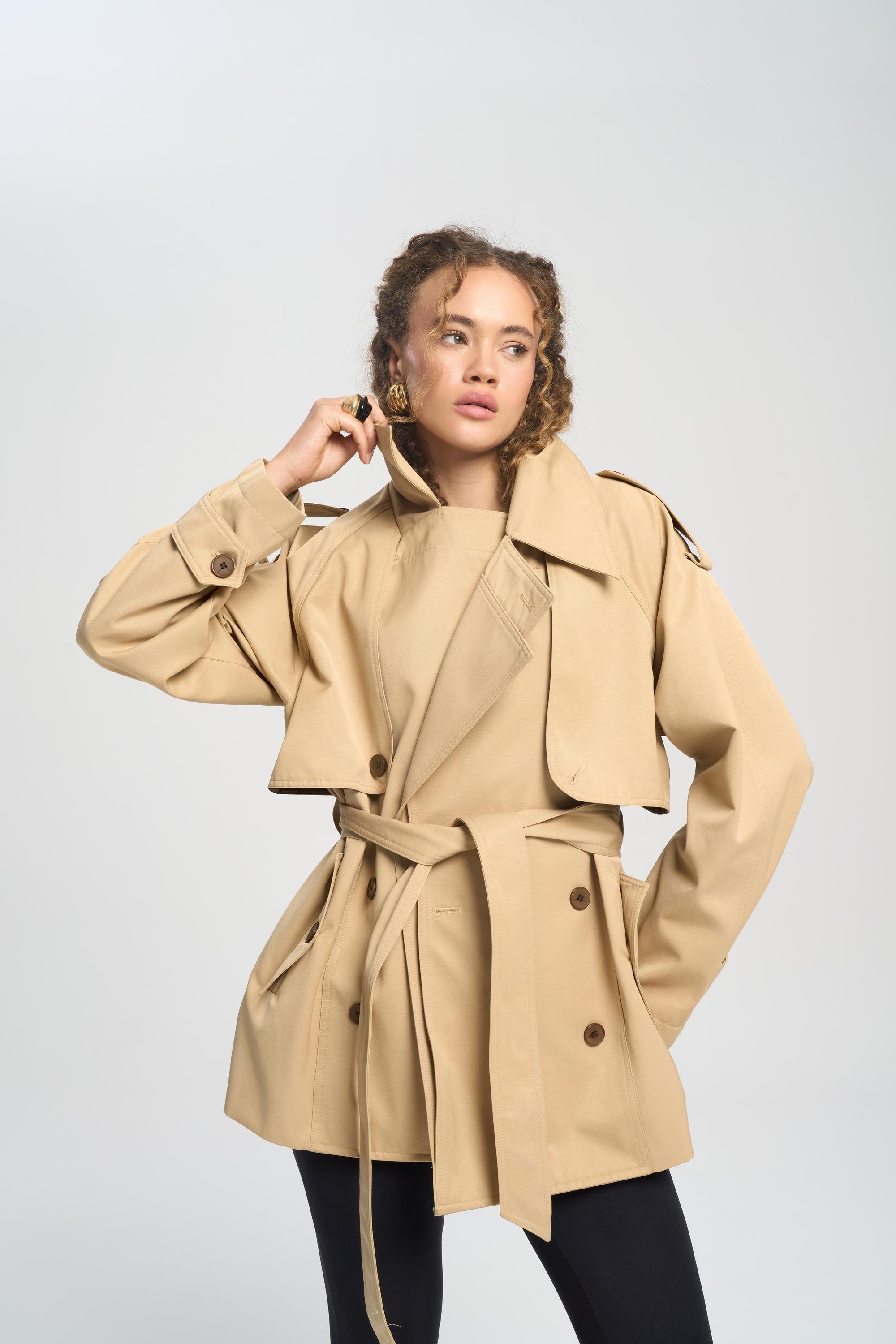 Basen altı hafif bol kesim, ayarlanabilir kemerli, cepli, rüzgarlık detaylı trençkot.