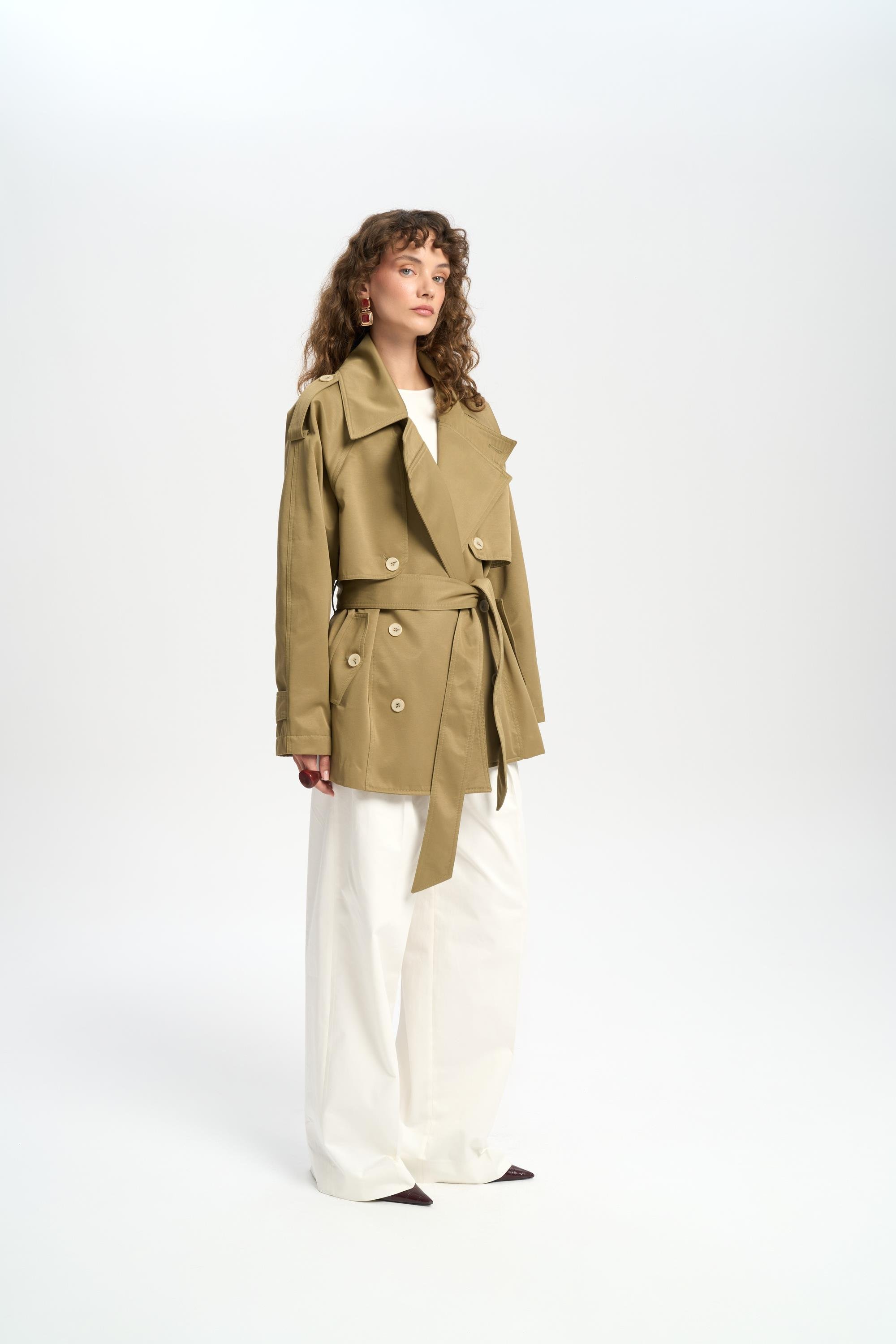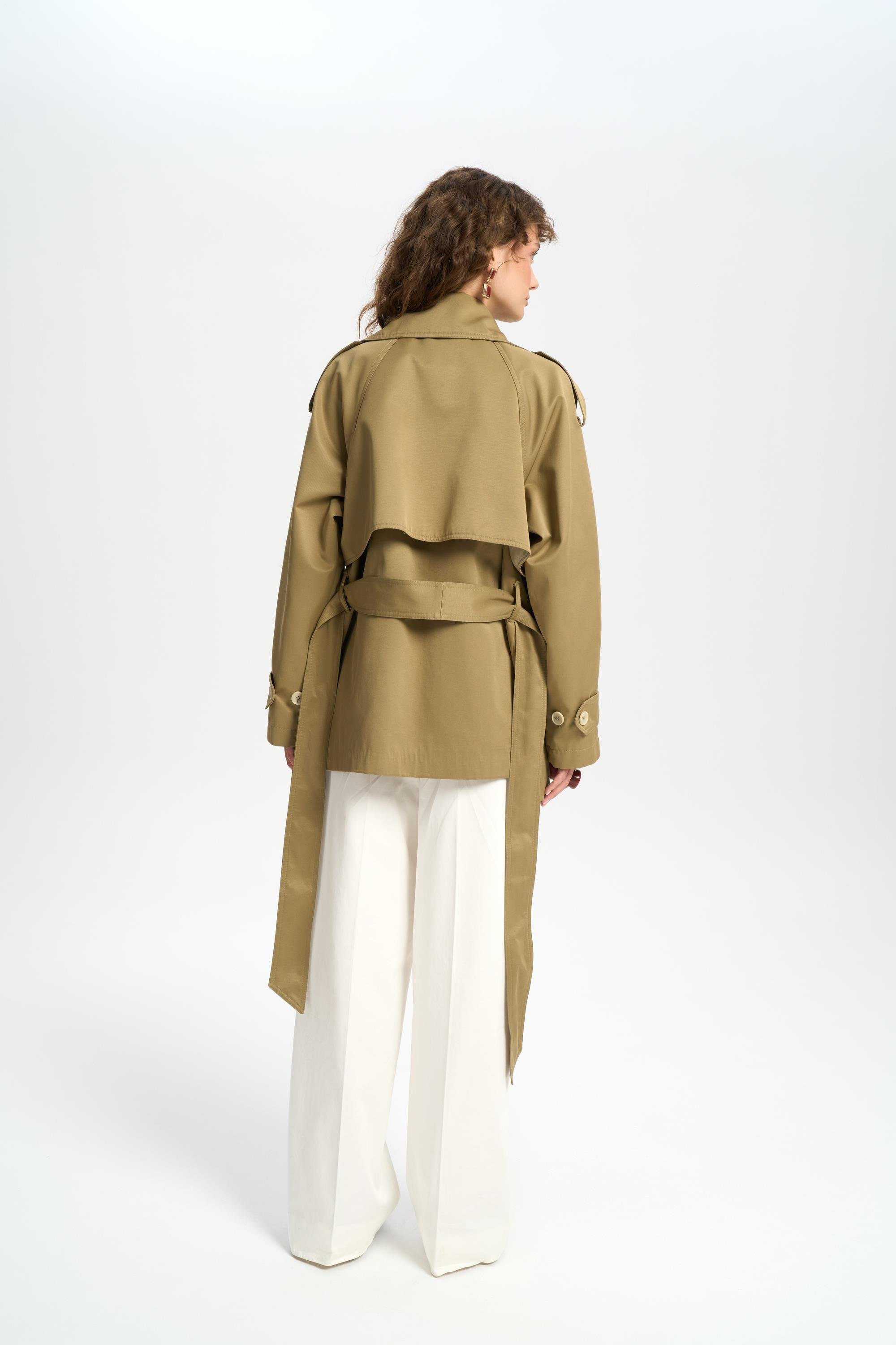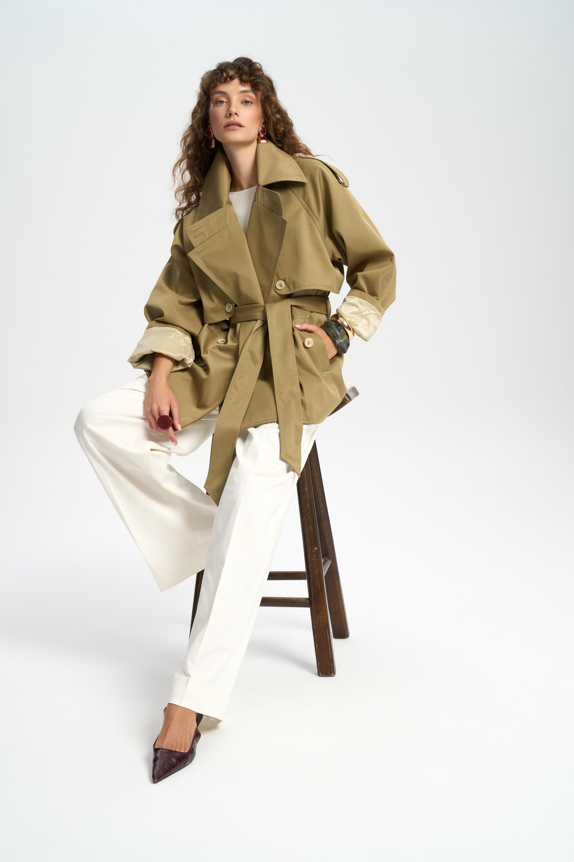 Basen altı hafif bol kesim, ayarlanabilir kemerli, cepli, rüzgarlık detaylı trençkot.
