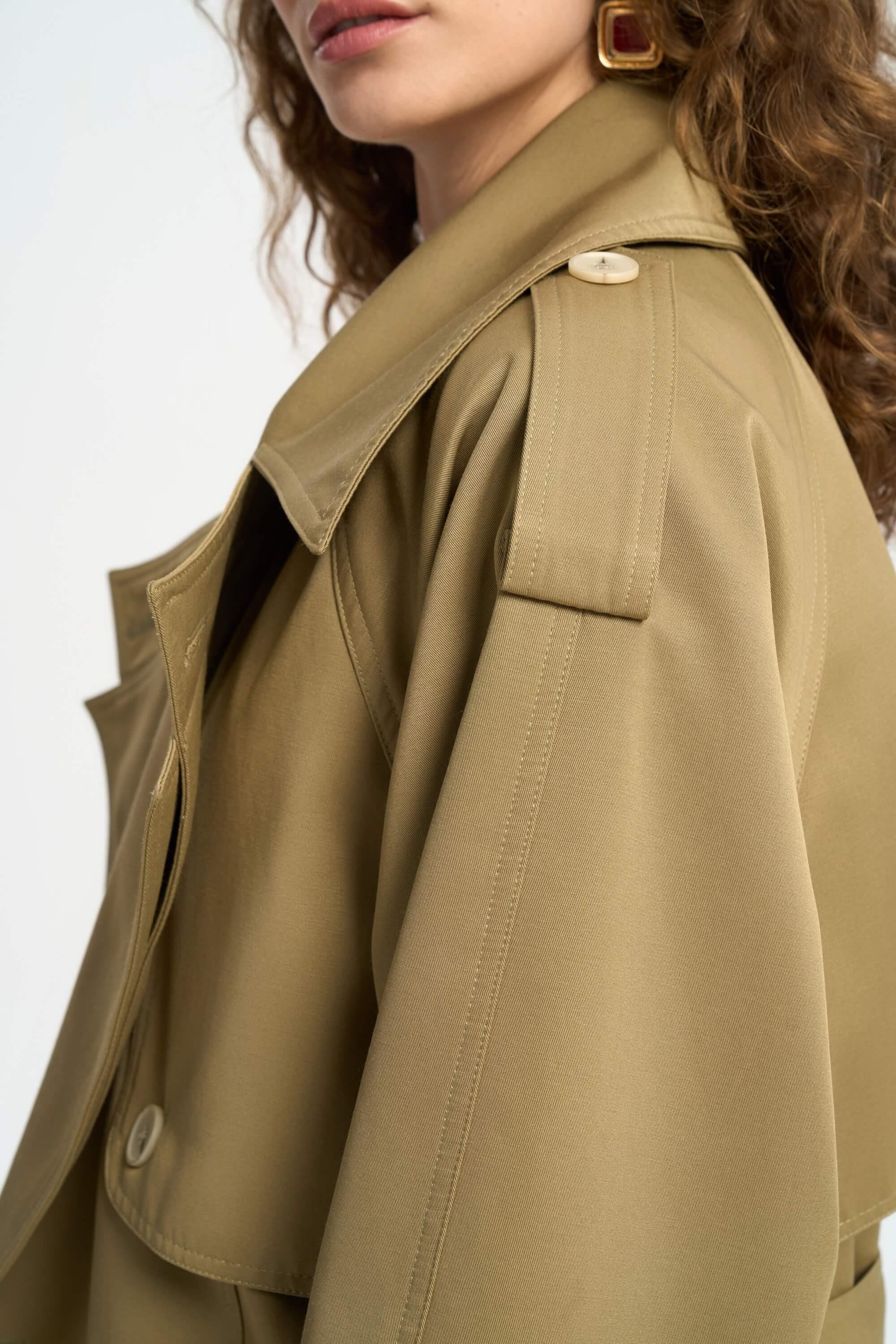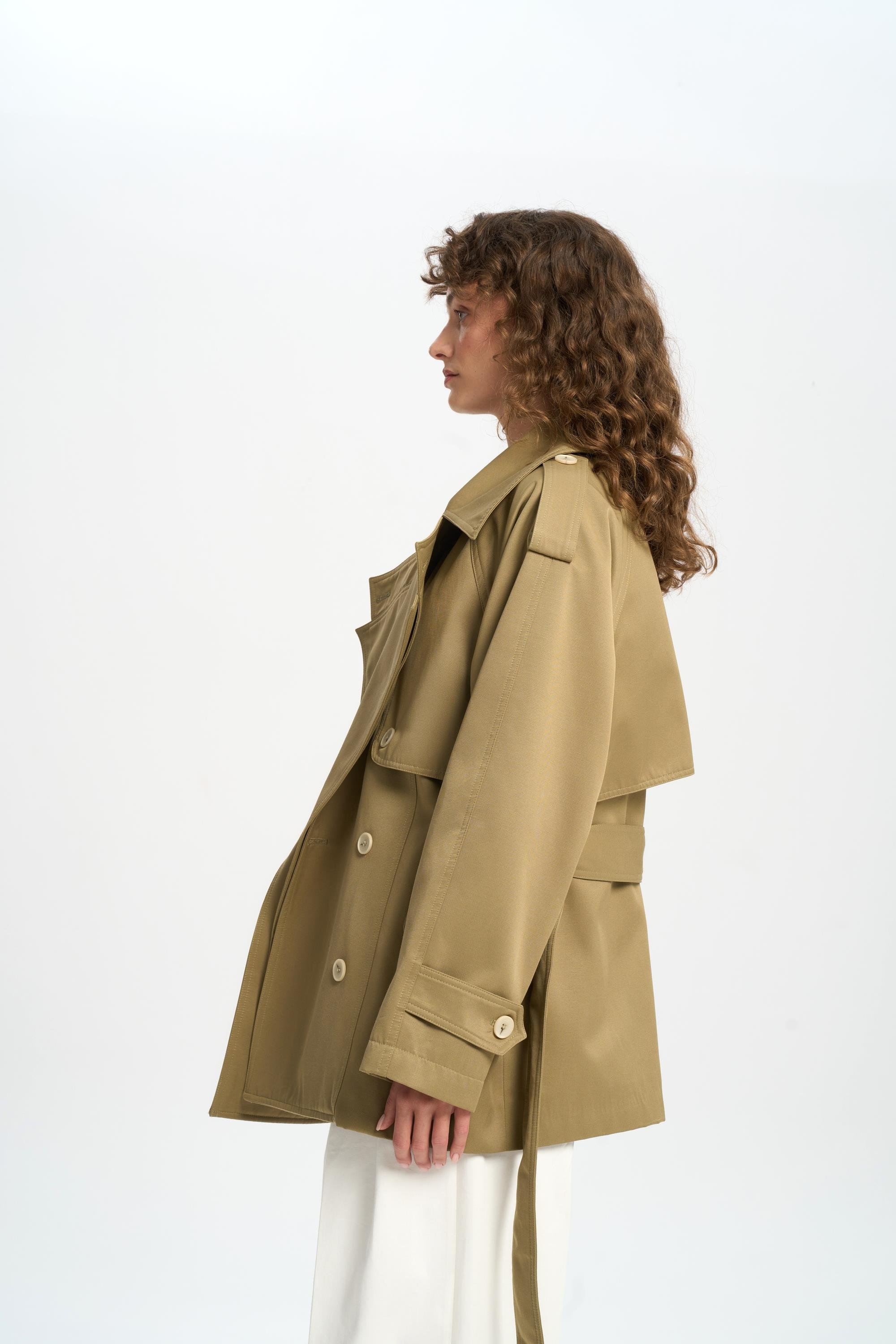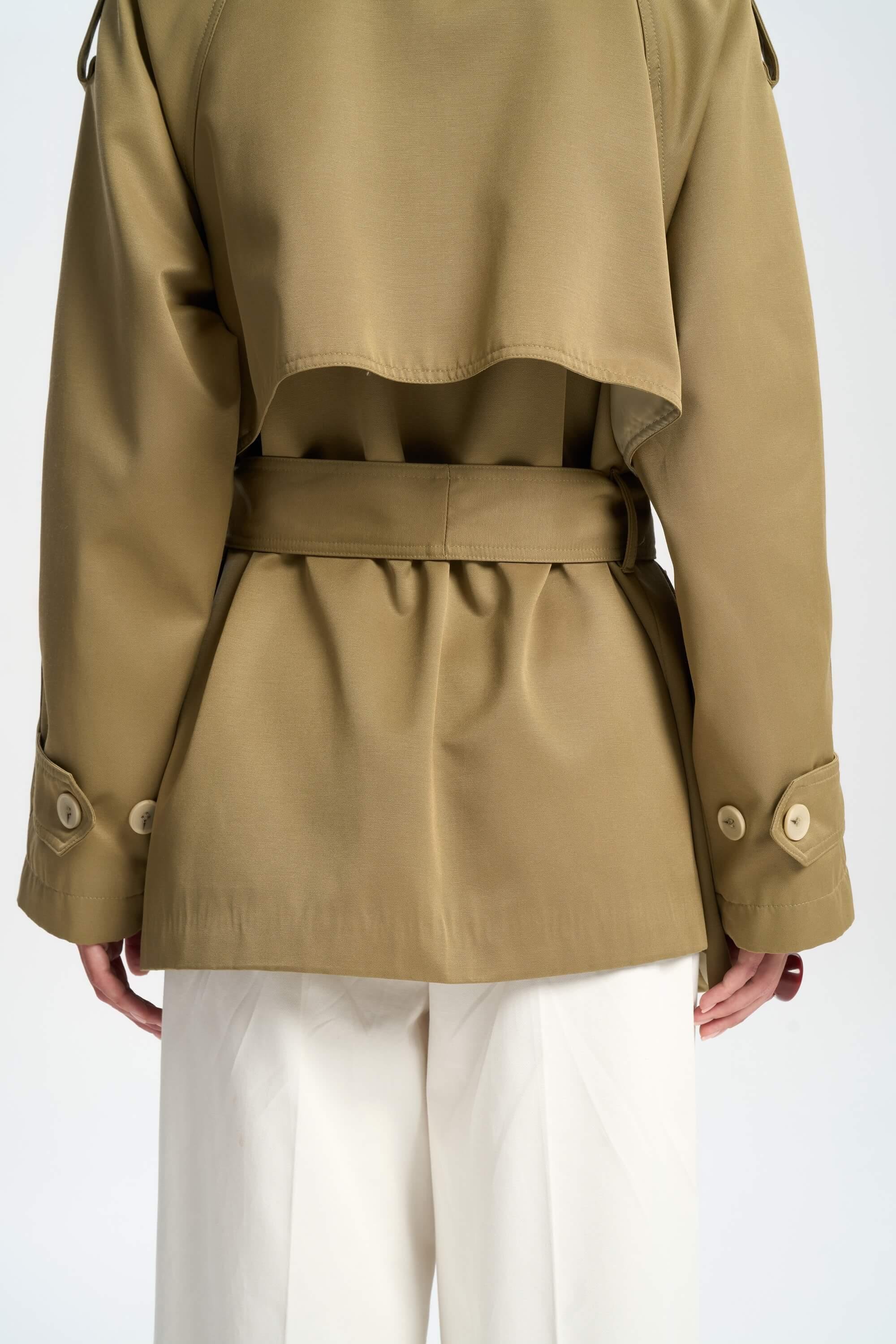 Basen altı hafif bol kesim, ayarlanabilir kemerli, cepli, rüzgarlık detaylı trençkot.