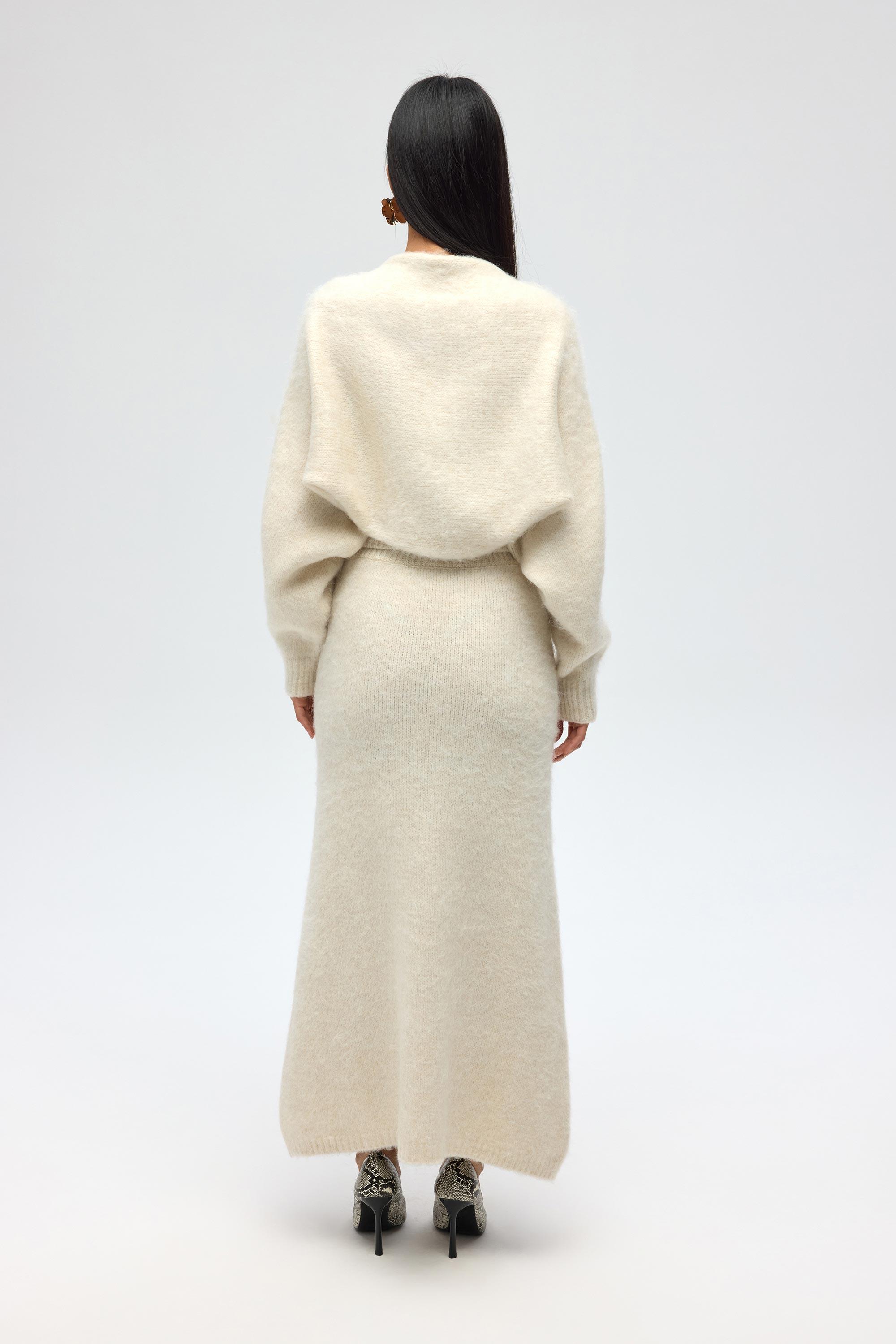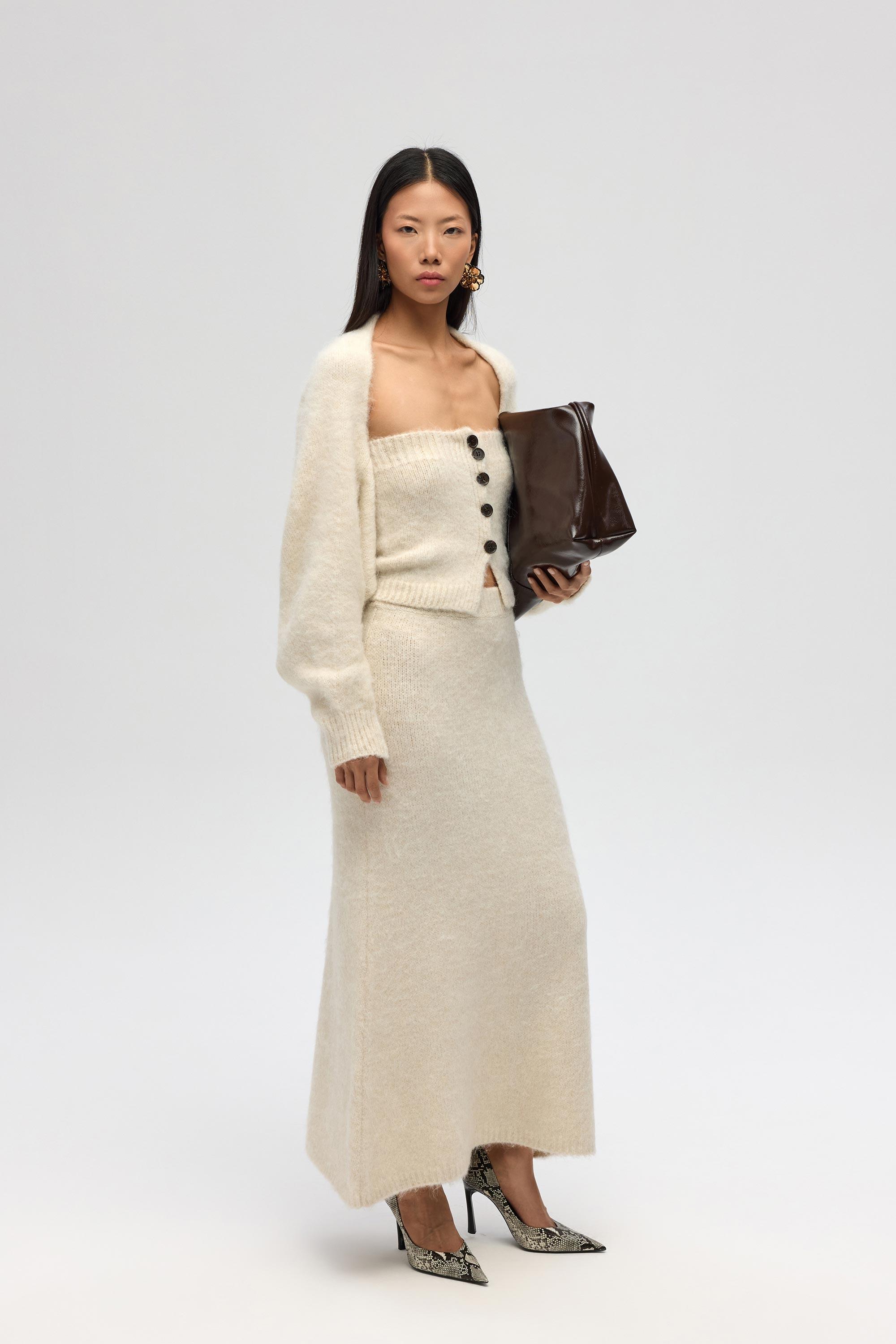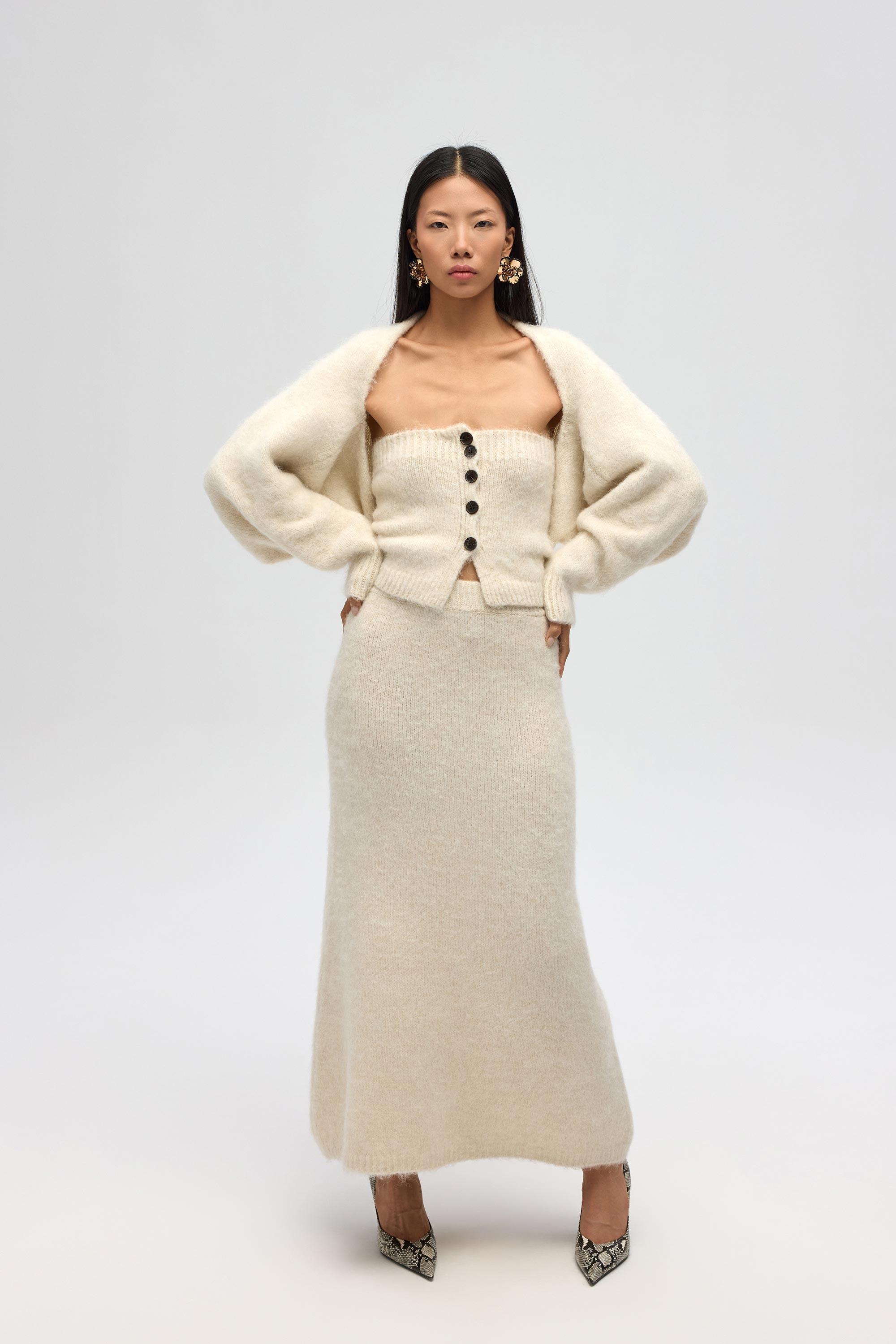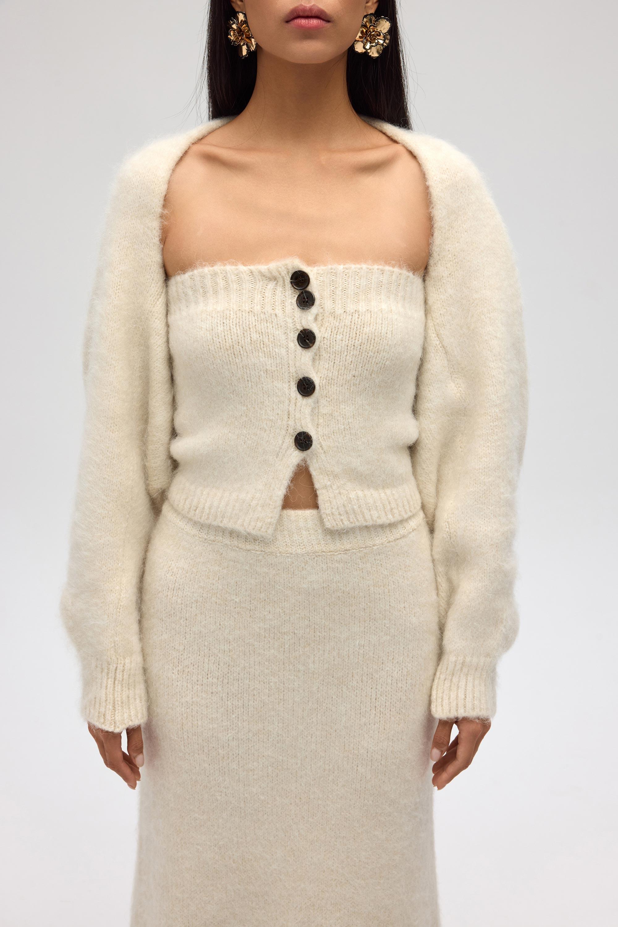 Bedene oturan formda 'V' yakalı, ön etek ucu üçgen detaylı ve kruvaze kapamalı triko kazak.