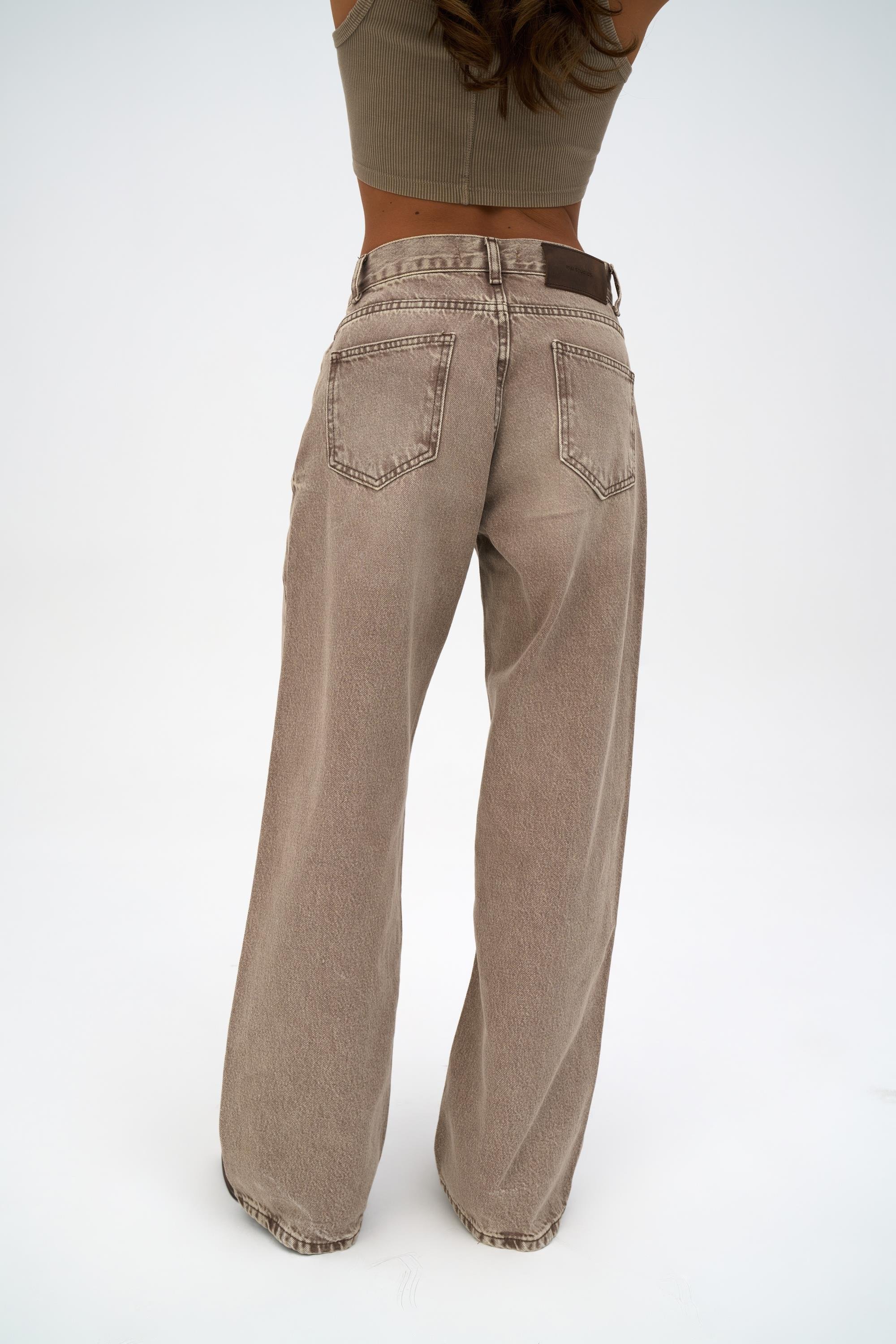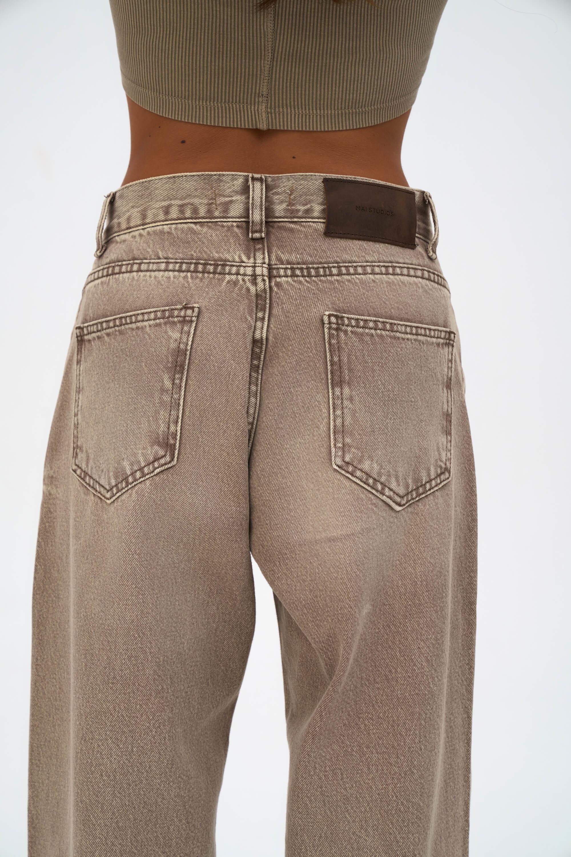 Yüksek bel, rahat kalıp ve geniş paçalı, eskitme görünümlü denim pantolon.