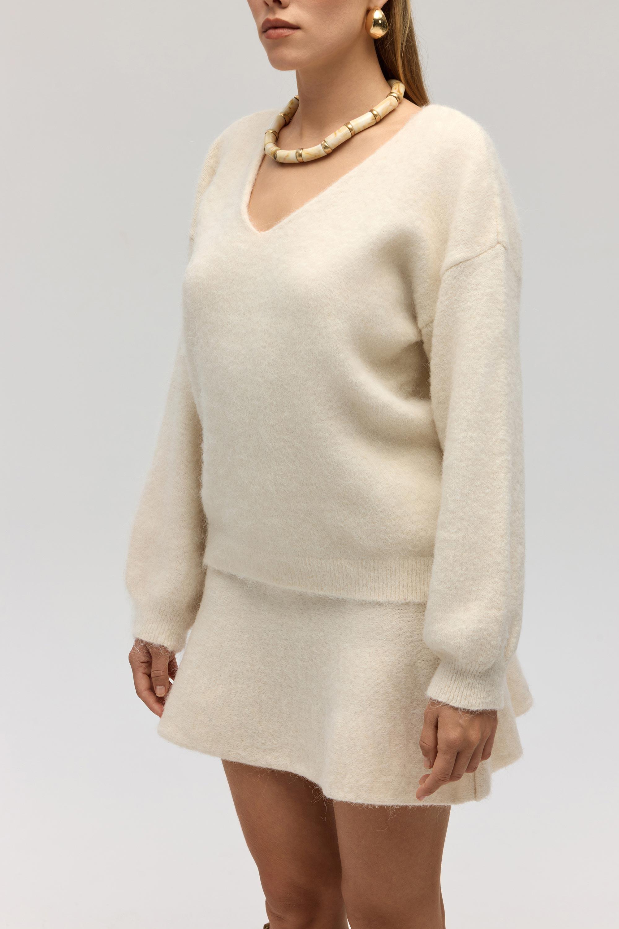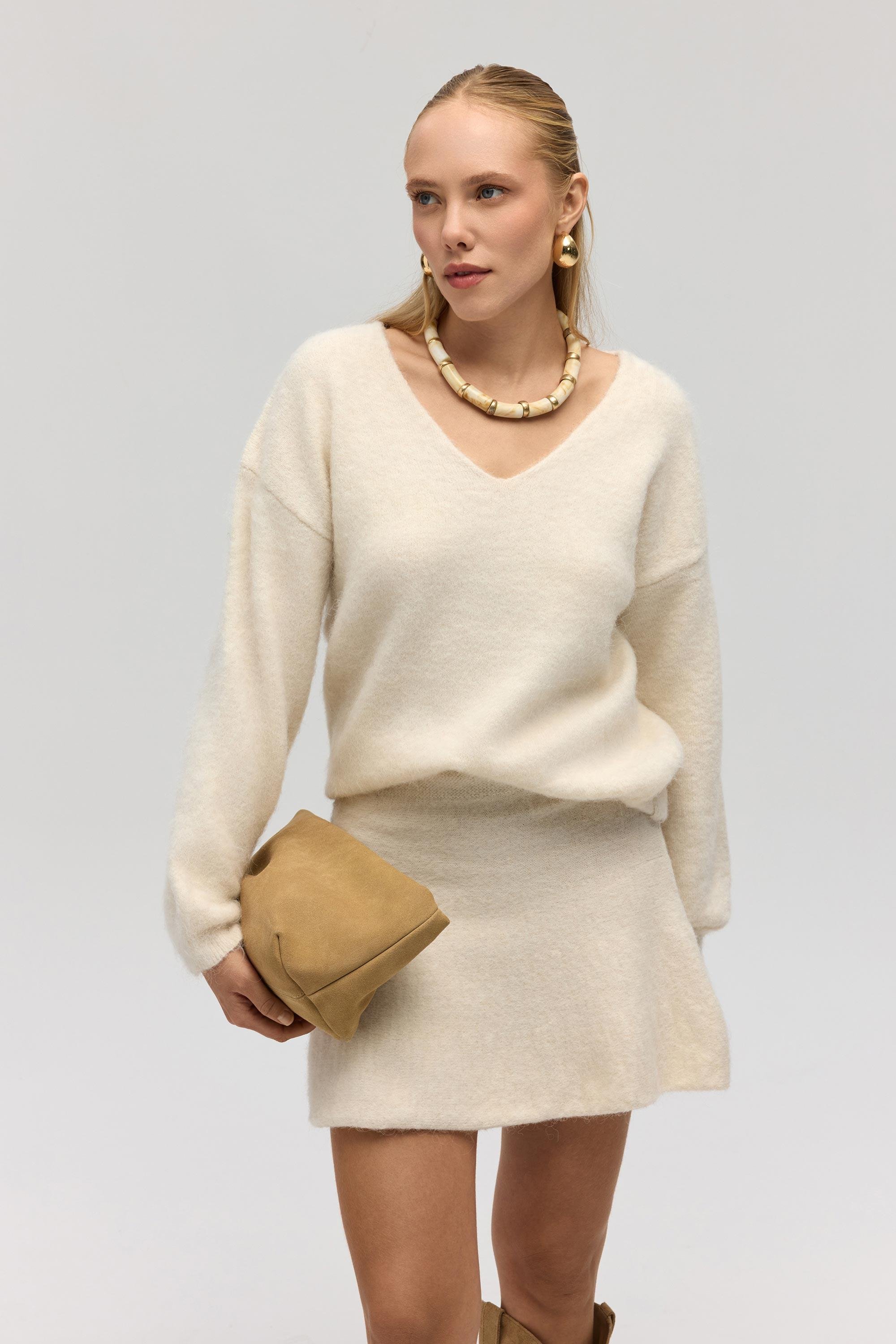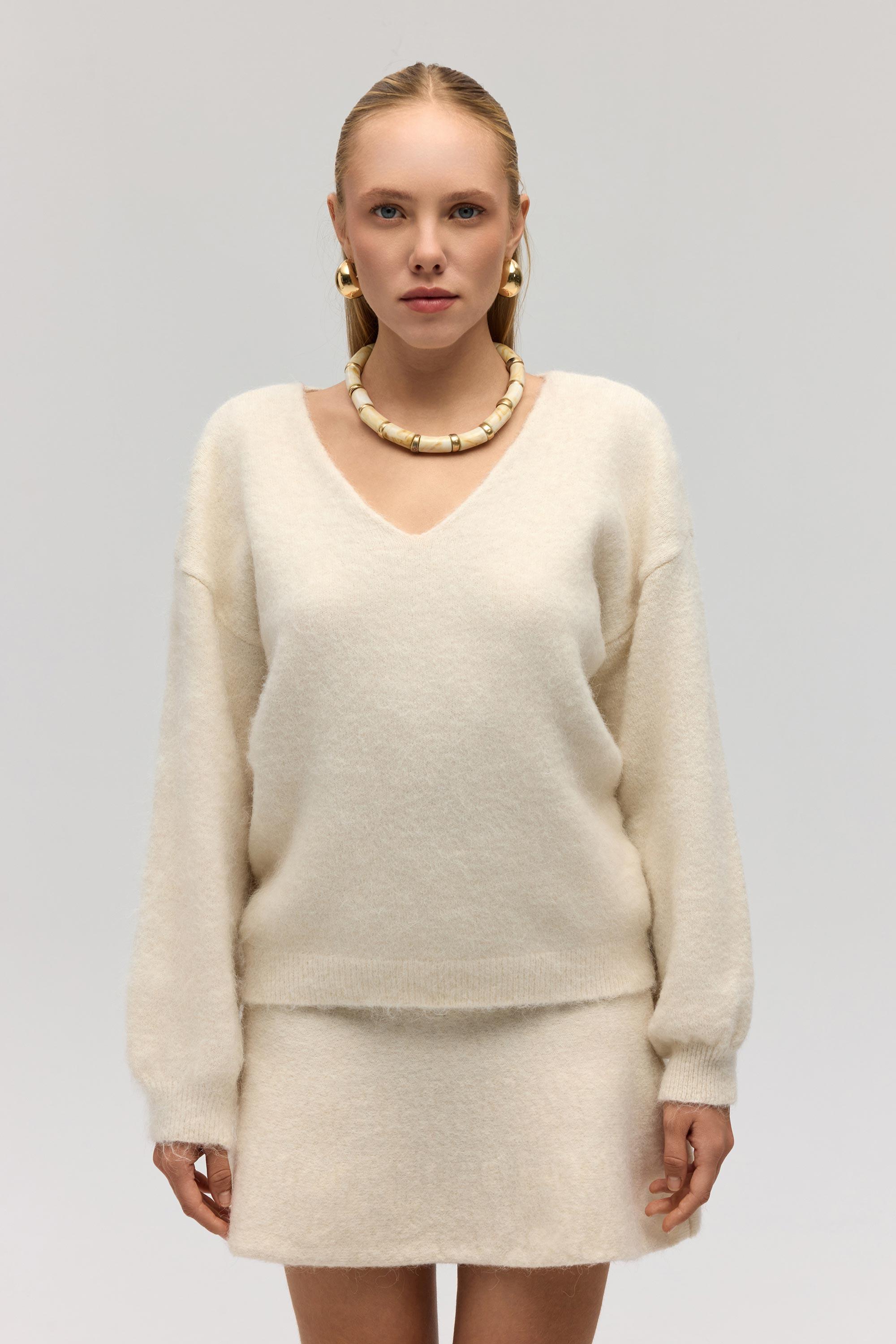 Rahat formda, etek ucu ve kol ağzı lastikli ve örgü detaylı "V" yaka triko kazak.