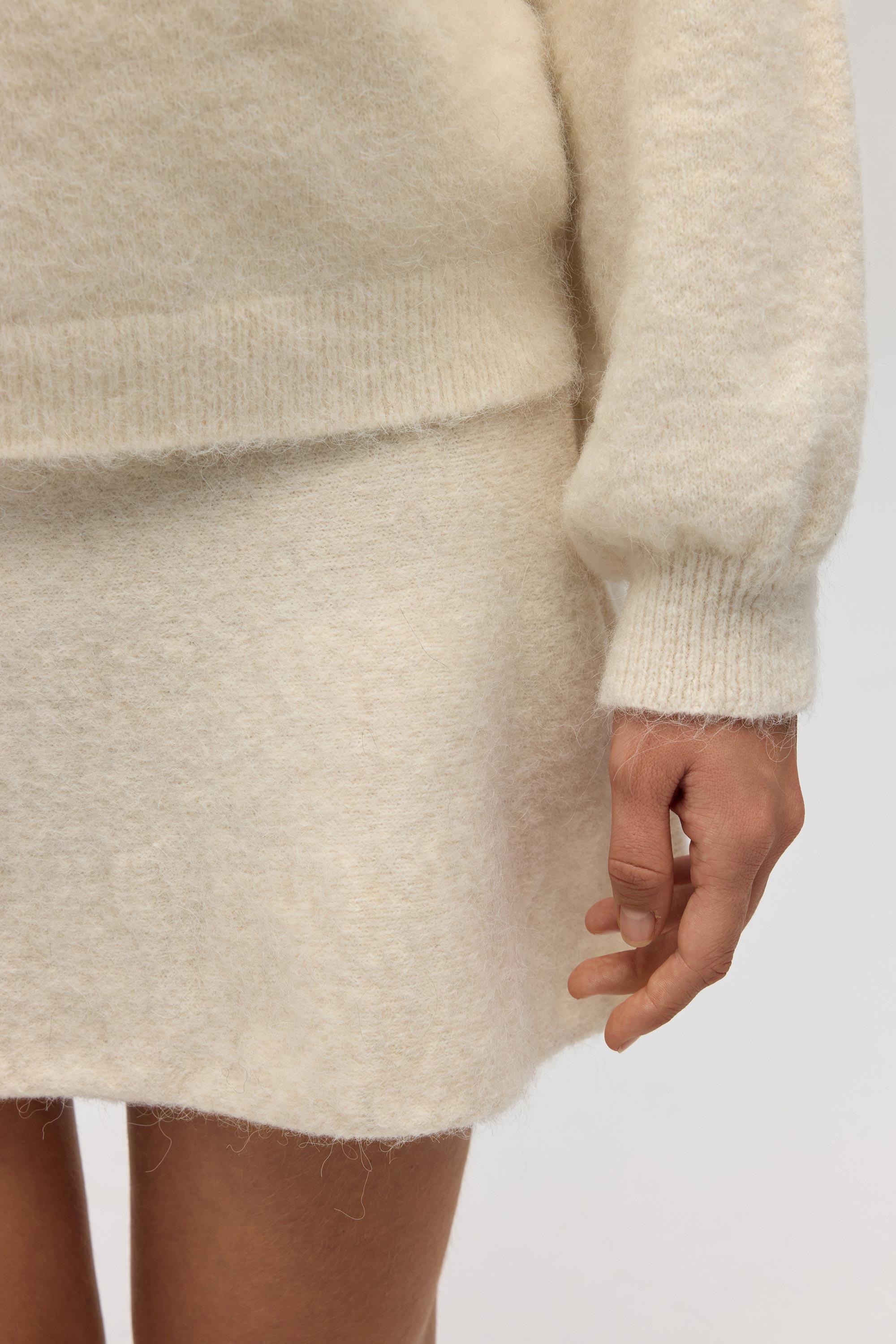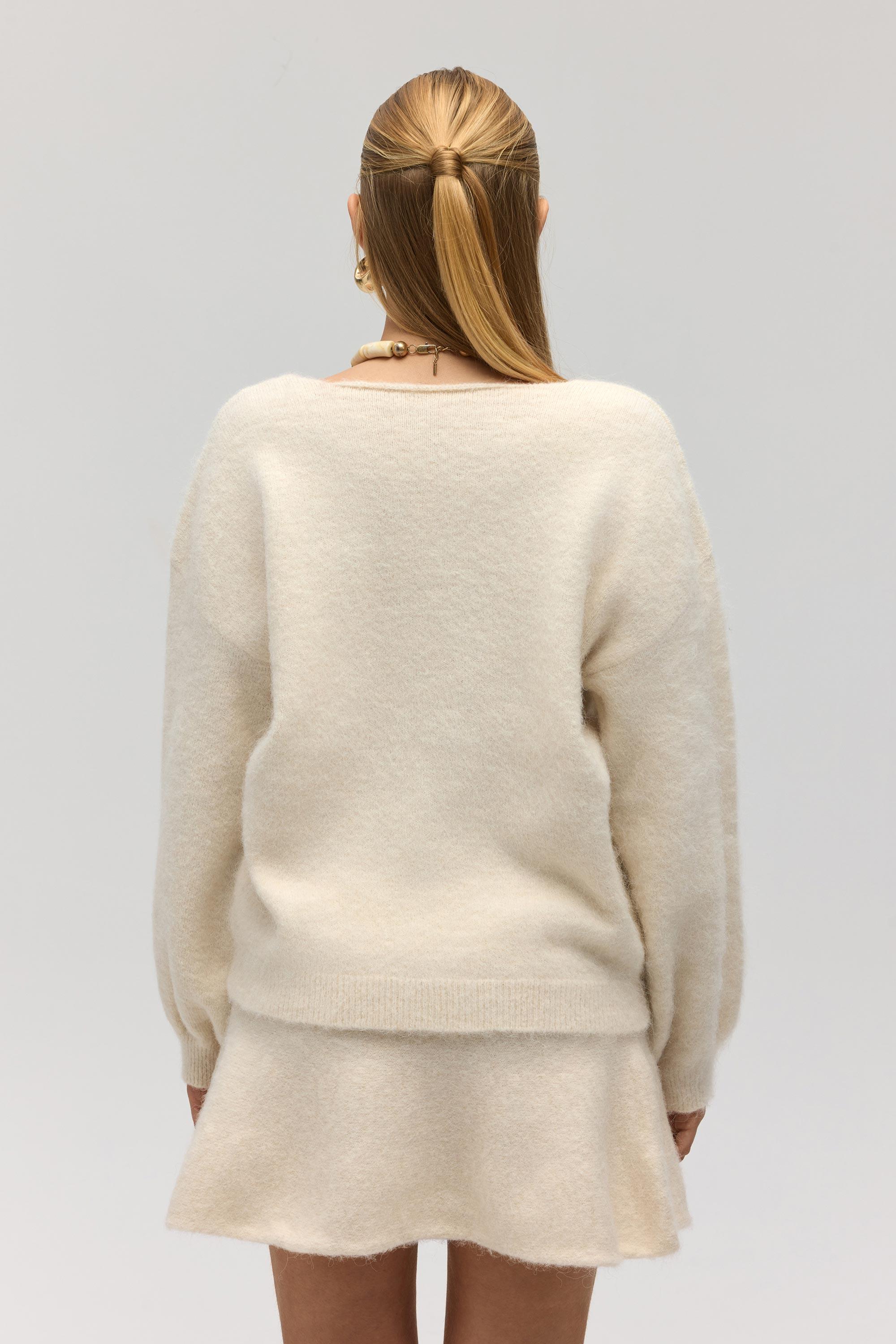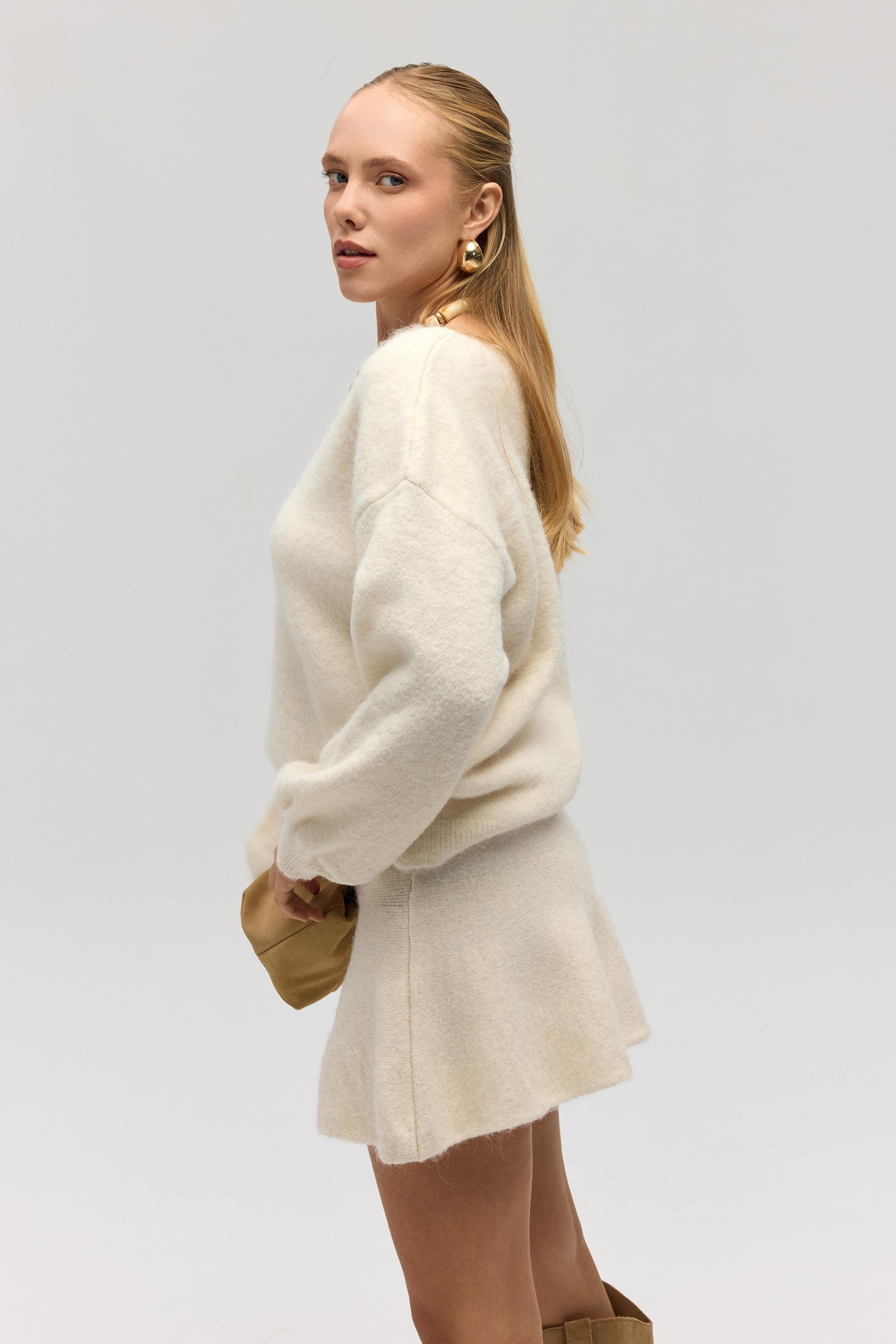 Rahat formda, etek ucu ve kol ağzı lastikli ve örgü detaylı "V" yaka triko kazak.