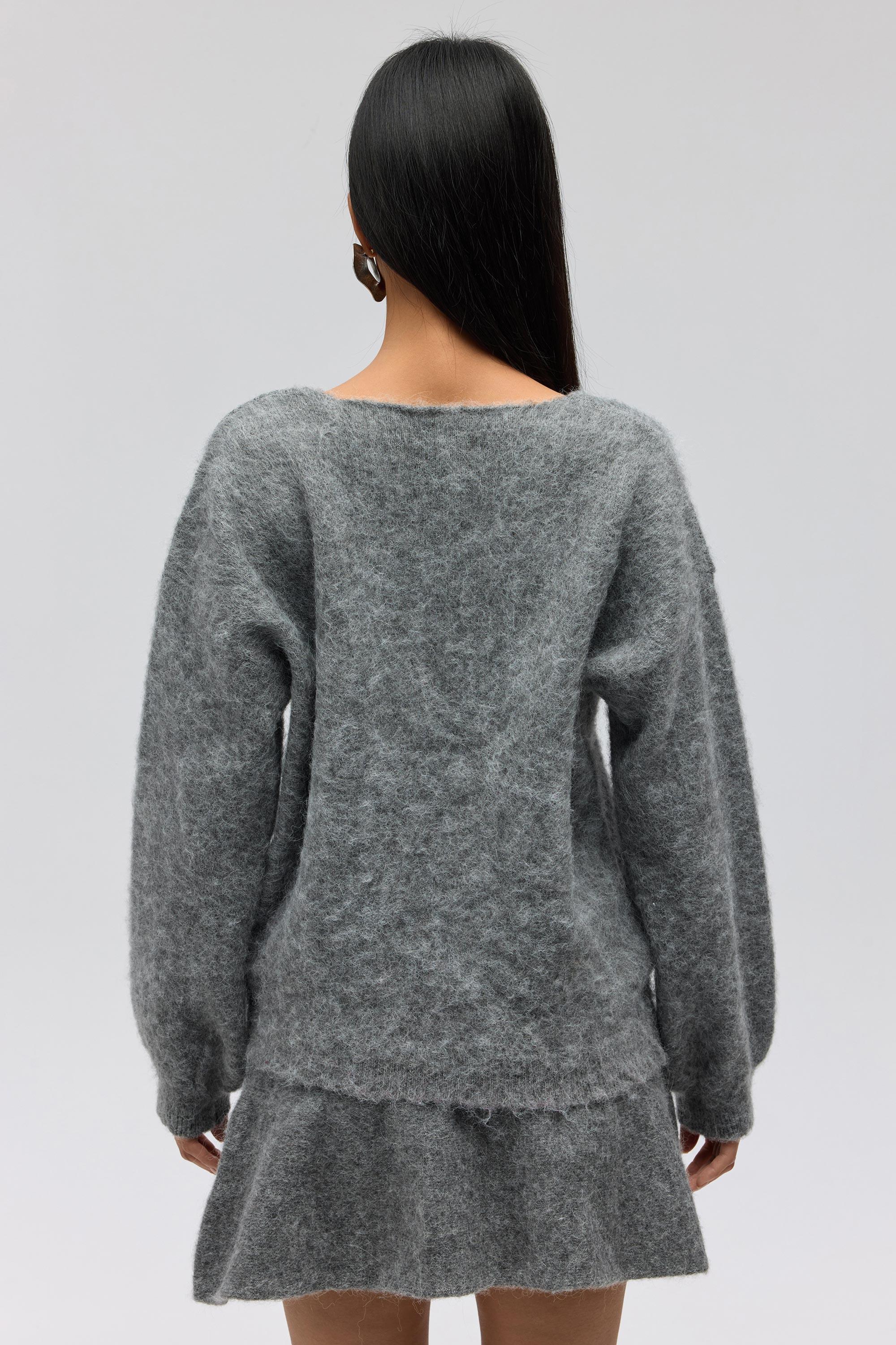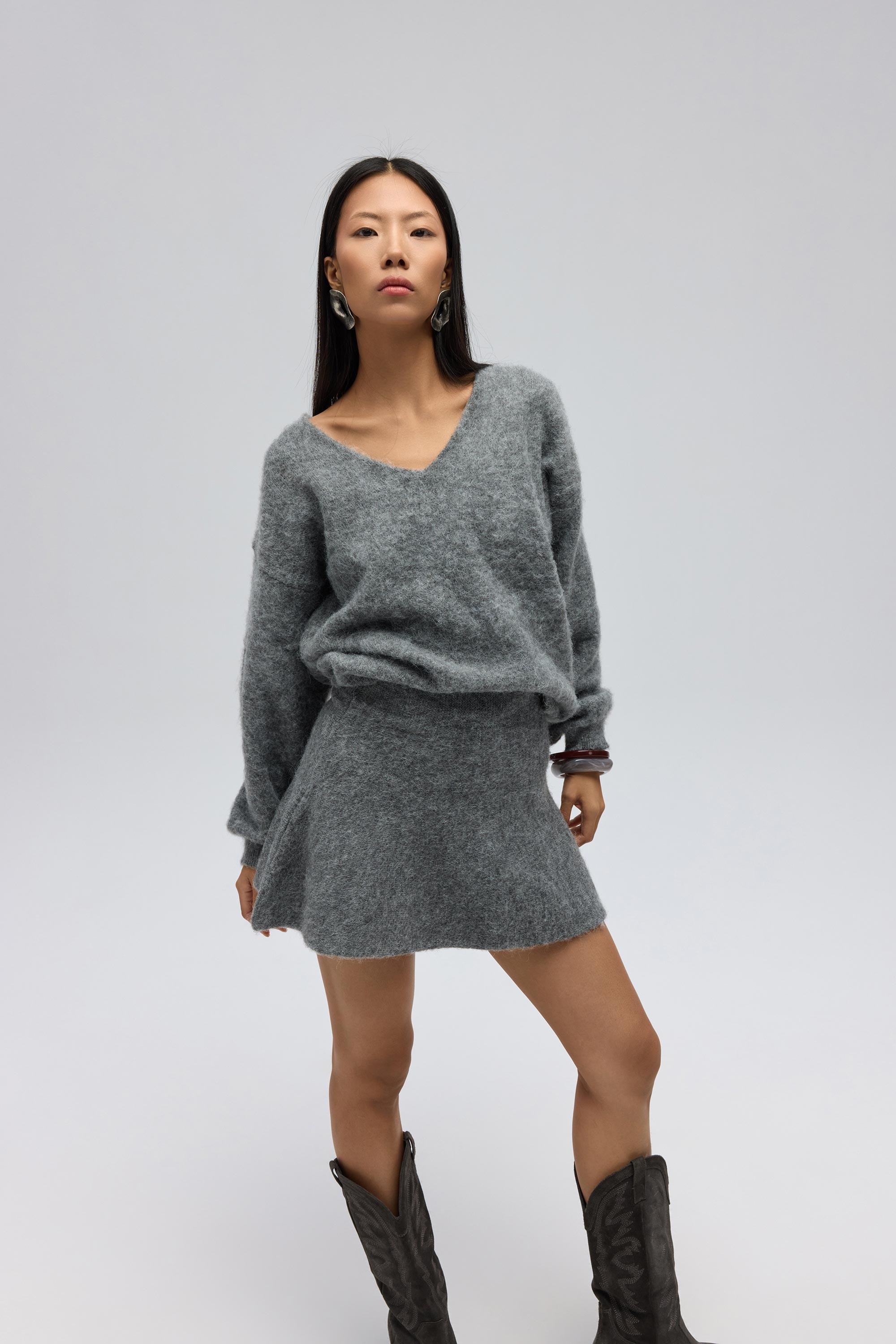 Rahat formda, etek ucu ve kol ağzı lastikli ve örgü detaylı "V" yaka triko kazak.